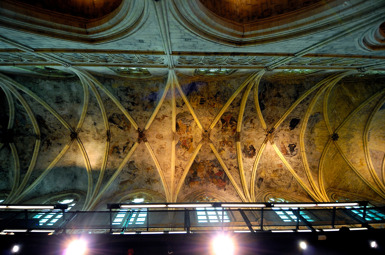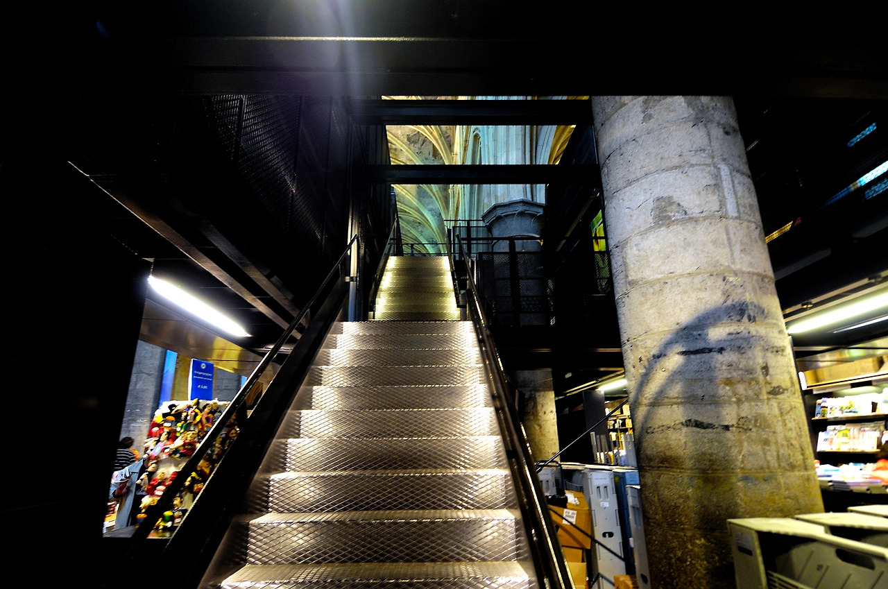 여하튼 책방 내부는, 교회 건물 구조를 그대로 두고 철제로 서가를 만들어 세 개층으로 쌓아 올렸다. 건물 창을 통해 교회 안으로 들어오는 빛을 그대로 활용한 지혜로움이 돋보인다. ‘Minimalist’ 답다고 해야 할까? 천장 프레스코화는 14세기 때의 그림인데 그동안 보완을 하지 않아 그런지 많이 낡았지만 3층 서고에 오르면 자세히 볼 수 있어 그런대로 좋다.