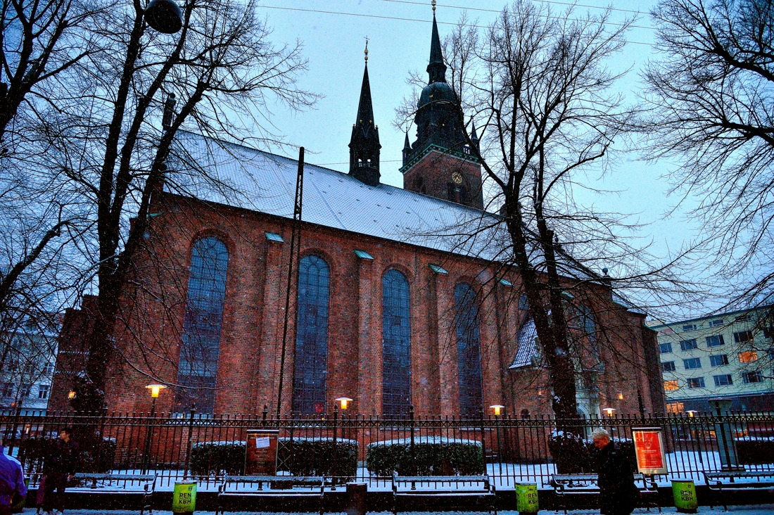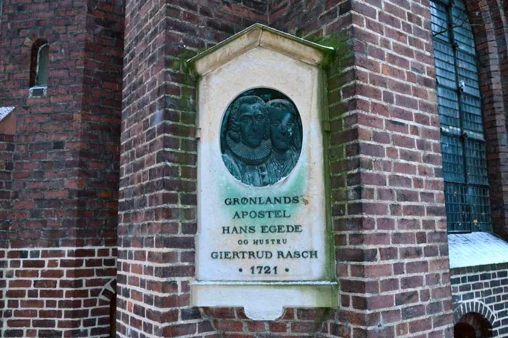 코펜하겐 시내 중심가 교회 벽에 한스 에게드 선교사 부부를 기리는 석판을 붙여 놓았다.