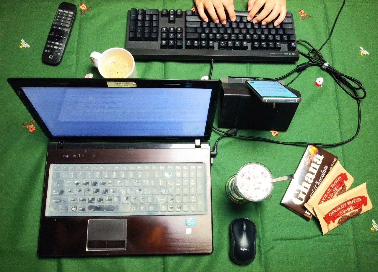 글쓰기 준비물: 노트북, 블루투스 키보드, 커피와 초콜릿, 카페 음악 스트리밍