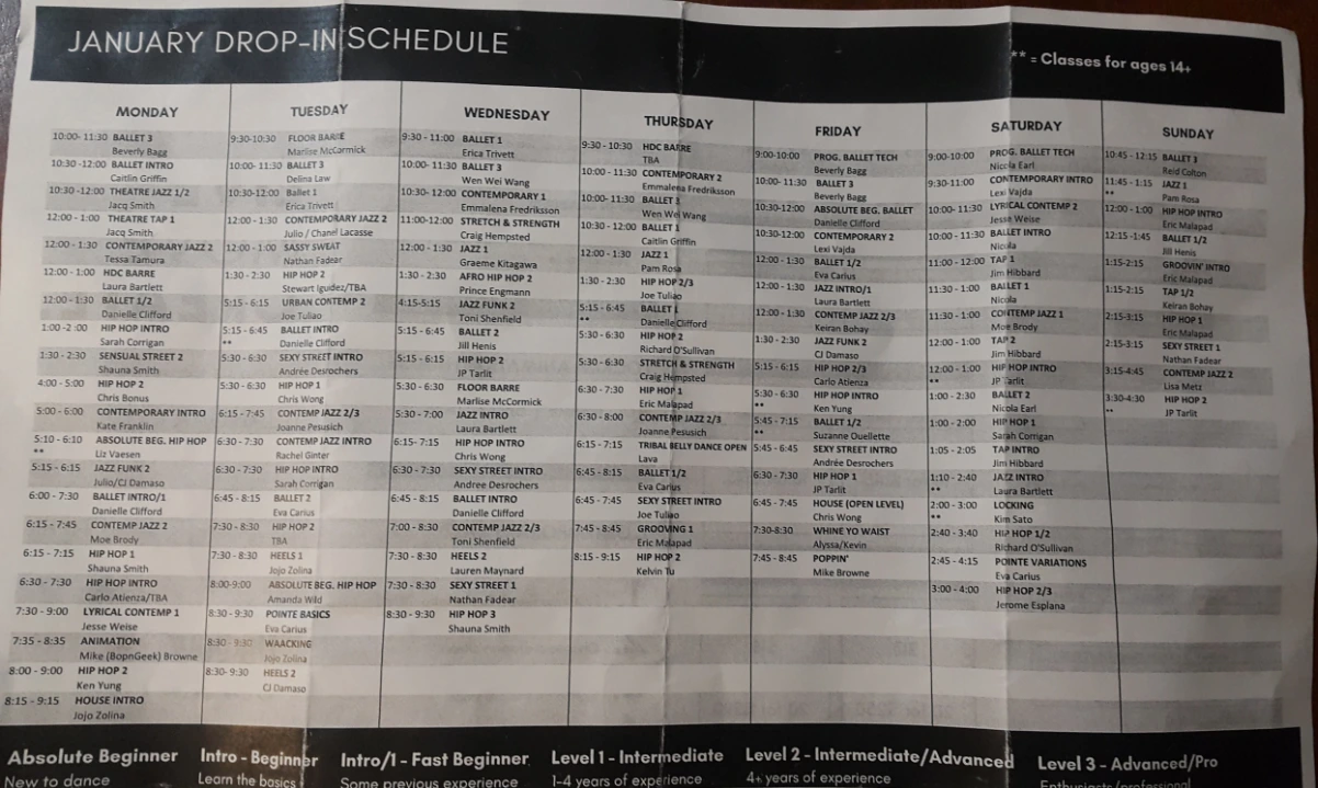 해보고 싶었는데 하지 못했던 일을 이곳에서 해보기로 했다. 춤을 선택한 이유 중에 하나는 돈을 버는 '일'이 아니라 내가 좋아할 수 있는 '일'에 집중해서 나의 정신과 체력을 소모하고, 성취의 기쁨을 맛보는 데 이만한 것이 없을 것 같다고 생각했기 때문이다. 선생님의 설명을 100% 이해하지 못하더라도 행동을 따라 하면 되니 큰 문제는 없을 테고, 외국인들 앞이니 왠지 덜 창피할 것 같기도 했다. 구글 지도에서 dance academy를 검색해서 다운타운 중심가에 있는 한 학원을 발견했다. 매일 아침부터 저녁까지 매시간 난이도별 수업이 있고, 시작 전에 바로 방문 등록해서 1회 체험해보는 것도 가능하다. 힙합, 탭, 발레, 재즈, 밸리, 팝핀, 스트립 등 굉장히 많은 종류의 수업이 있고 5회권, 10회권, 20회권 등 듣고 싶은 대로 등록할 수도 있다. 정말 다양한 국적과 나이 때의 사람들이 매 시간 수업을 들으러 이곳에 온다. 여자가 90% 이상이지만 어떤 수업에도 한두 명의 남자들도 있다. 춤을 배우는 모든 학생들은 거울 앞에서 굉장히 당당하고, 선생님이 알려주는 동작을 100% 똑같이 하는 것이 아니라 자기만의 스타일로 춤사위를 조금씩 바꾸기도 한다. 하나의 연속된 춤을 익히고 따라 할 때마다 모두 환호를 지르며 박수를 치고, 부족하지만 해냈다는 것을 함께 기뻐한다.
