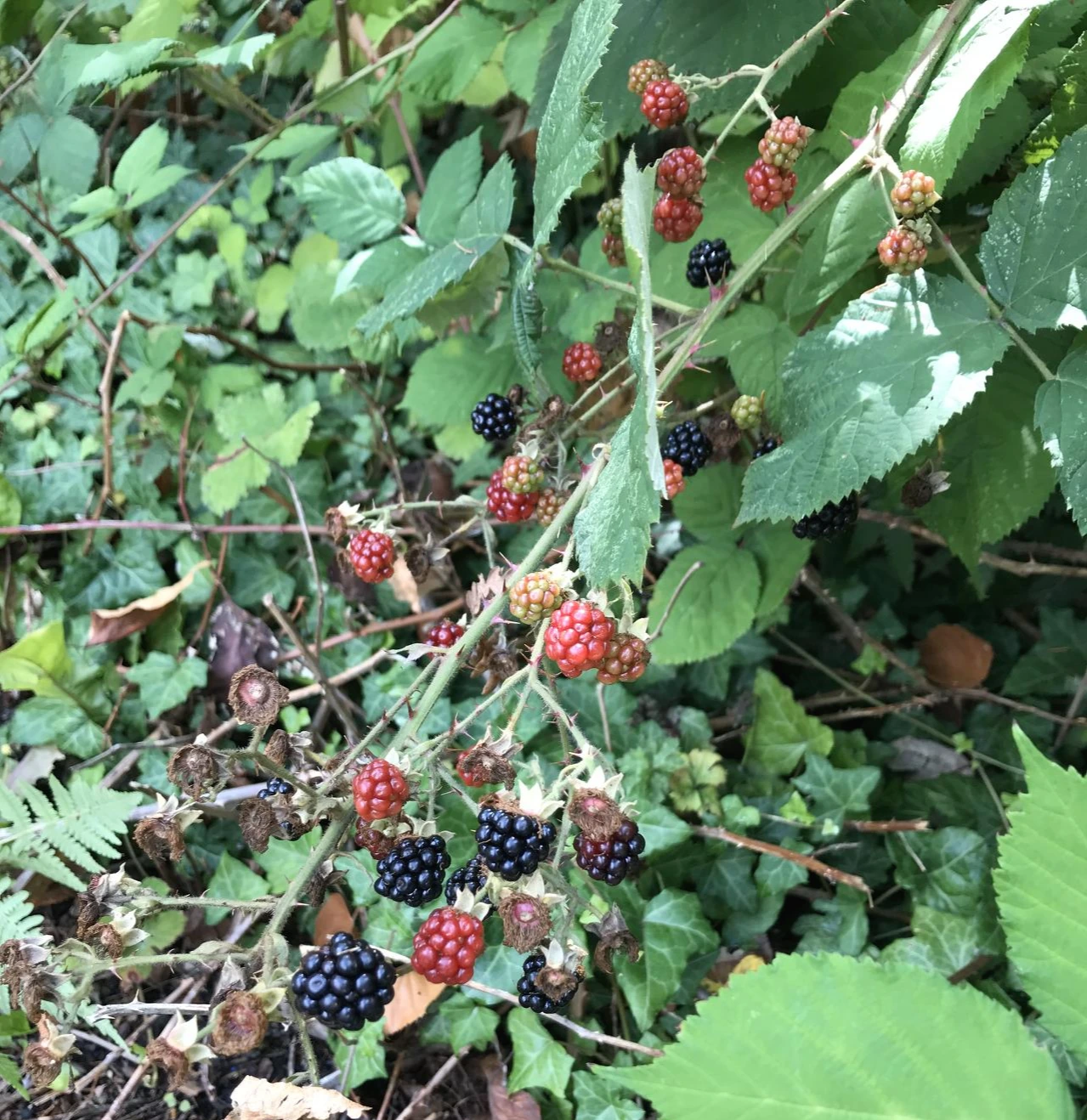 공원의 운동장과 호수, 그리고 덤불에 열리는 블랙베리