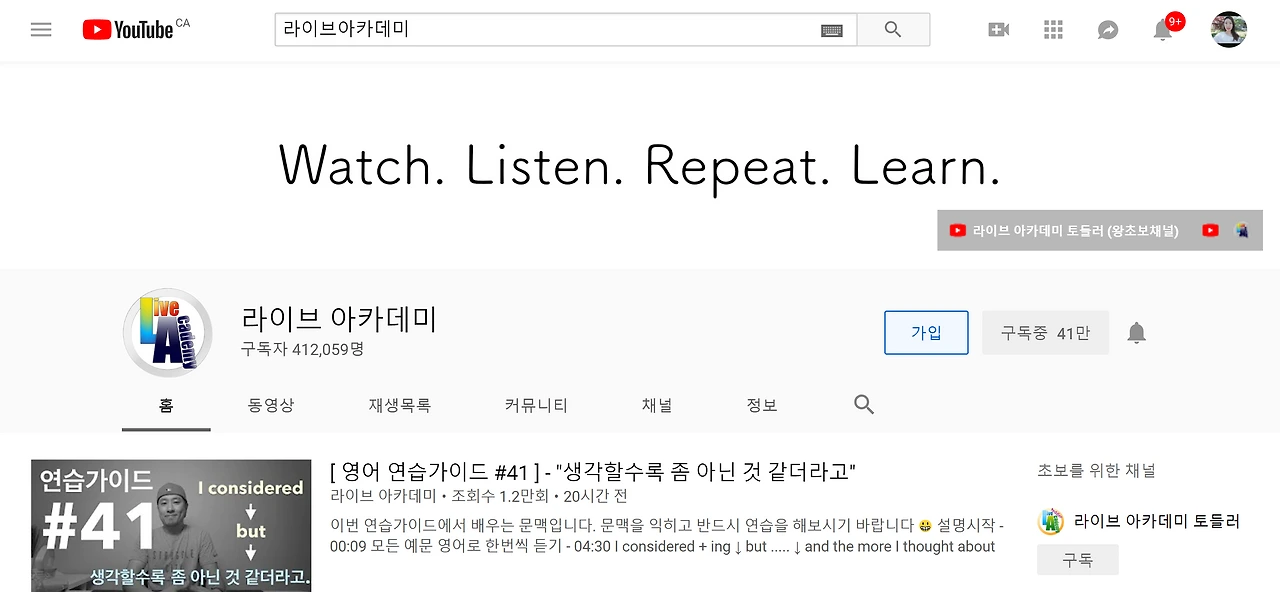 영어 스피킹은 혼자서 많이 연습하고 따라 하는 수밖에 없다. 학원 수업이 제일 효율이 낮고, 비슷한 실력의 사람들끼리 그룹 스피킹을 하는 것은 큰 도움이 되지 않는 것 같다. 원어민이나 영어 선생님들의 영상을 보면서 무조건 따라 하고, 기회가 있을 때마다 실제로 써먹고 입에 붙이는 게 답이다. 그래서 내가 가장 많이 찾는 공부 콘텐츠는 유튜브와 팟캐스트이고, 고맙게도 돈 들지 않고도 공부할 수 있다. 많이 보는 채널 몇 가지도 추천한다.