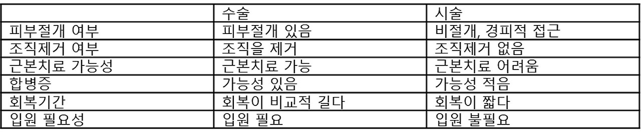 한 줄 요약: 마취나 피부 절개의 여부와 상관없이, 내 몸의 조직을 덩어리로 떼어내거나 덧붙이는 행위는 수술이고, 조직의 첨삭이 없이 미세한 물리, 화학적 변화를 주는 경우를 시술이라고 한다.