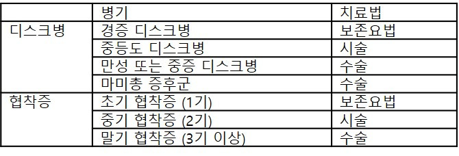 한 줄 요약: 디스크 병은 가변적이다. 그러므로 보존요법이나 비수술 치료가 유효하다. 반면에, 협착증은 지속된다. 변하지 않는다. 1,2기에는 비수술요법, 3,4기에는 수술적 치료가 필요하다.