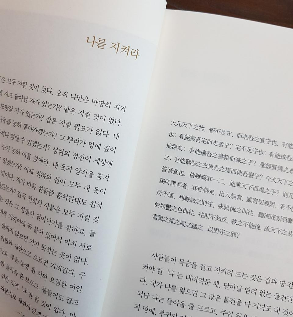 “무릇 천하의 사물은 모두 지킬 것이 없다. 오직 나만은 마땅히 지켜야 한다. 내 밭을 등에 지고 달아날 자가 있는가? 밭은 지킬 것이 없다. 내 집을 머리에 이고 도망갈 자가 있는가? 집은 지킬 필요가 없다. … 결국 천하의 사물은 모두 지킬 것이 없다. 오직 이른바 ‘나’라는 것은 그 성질이 달아나기를 잘하고, 들고 나는 것이 일정치가 않다. 비록 가까이에 꼭 붙어 있어서 마치 서로 등지지 못할 것 같지만, 잠깐만 살피지 않으면 가지 못하는 곳이 없다.… 그래서 천하에 잃기 쉬운 것에 ‘나’만 한 것이 없다.”