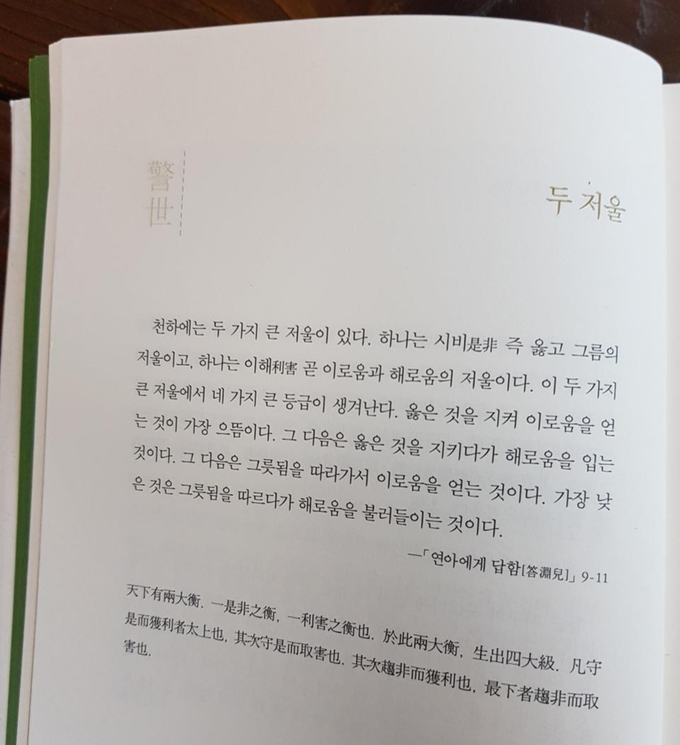 다산을 오랫동안 연구해 온 정민 교수는 그의 저서 <다산어록 청상(茶山語錄 淸賞)>에서, 옳은 것을 지켜 이로움을 얻기란 어려운 일이며 옳은 것을 지키다가 해를 입는 것은 싫어해서 어리석은 사람들은 그른 일을 해서라도 이로움을 얻으려고 하다가 결국 해로움만 불러들이게 된다고 했다. ‘첫째는 드물고 둘째는 싫어 셋째를 하다가 넷째가 되고 마는 것’이란 설명이다.