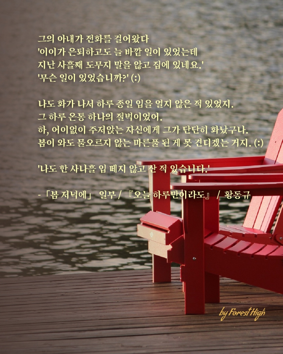 시인 또한 한 사나흘 침묵으로 산 적 있다고 고백한다. 나 또한 충동은 발화되었지만 그러진 못했다. 시인처럼 대학교수를 했거나, 나처럼 명예퇴직이라도 한 사람에게는 어리광과도 같이 보일 수도 있다.