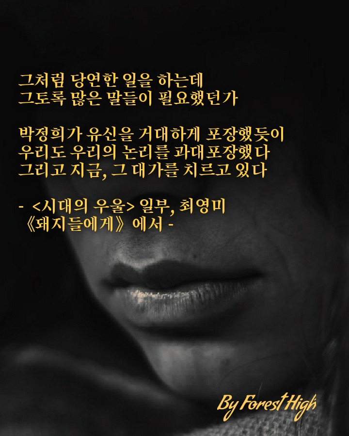 세상을 정의롭게 만든다는 '당연한 일'을 하면서 화려한 말만 내뱉고, 경력을 포장하고, 왕관을 쓰고, 진주를 탐하는 천박한 돼지와도 같은 행태는 비유적이지만 직관으로 다가온다. 모두들 자기를 알리는데 급급하고 난리다.