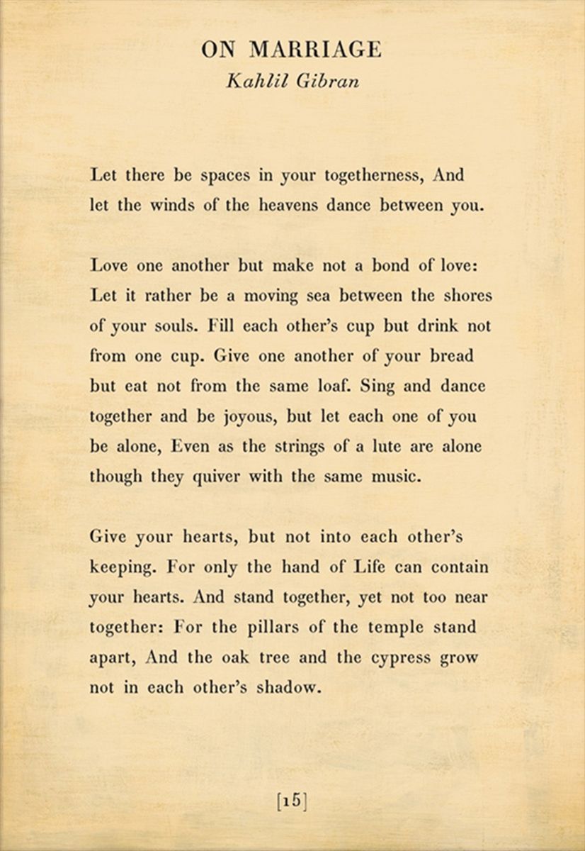 결혼 축사에 이따금 인용되는, 칼릴 지브란의 <예언자> 중 ‘결혼에 대하여(on marriage)’의 첫 문장이다. <예언자>는 1923년 출간된, 성경 다음으로 많이 팔린 책이다. 예언자 ‘알 무스타파’가 유배 생활을 마치고 떠나기 위해 항구에 도착했을 때, 군중들이 사랑, 자유, 우정, 시간, 쾌락 등을 묻고 알 무스타파가 대답한다. ‘결혼에 대하여’의 마지막 문장은 이렇게 끝난다.