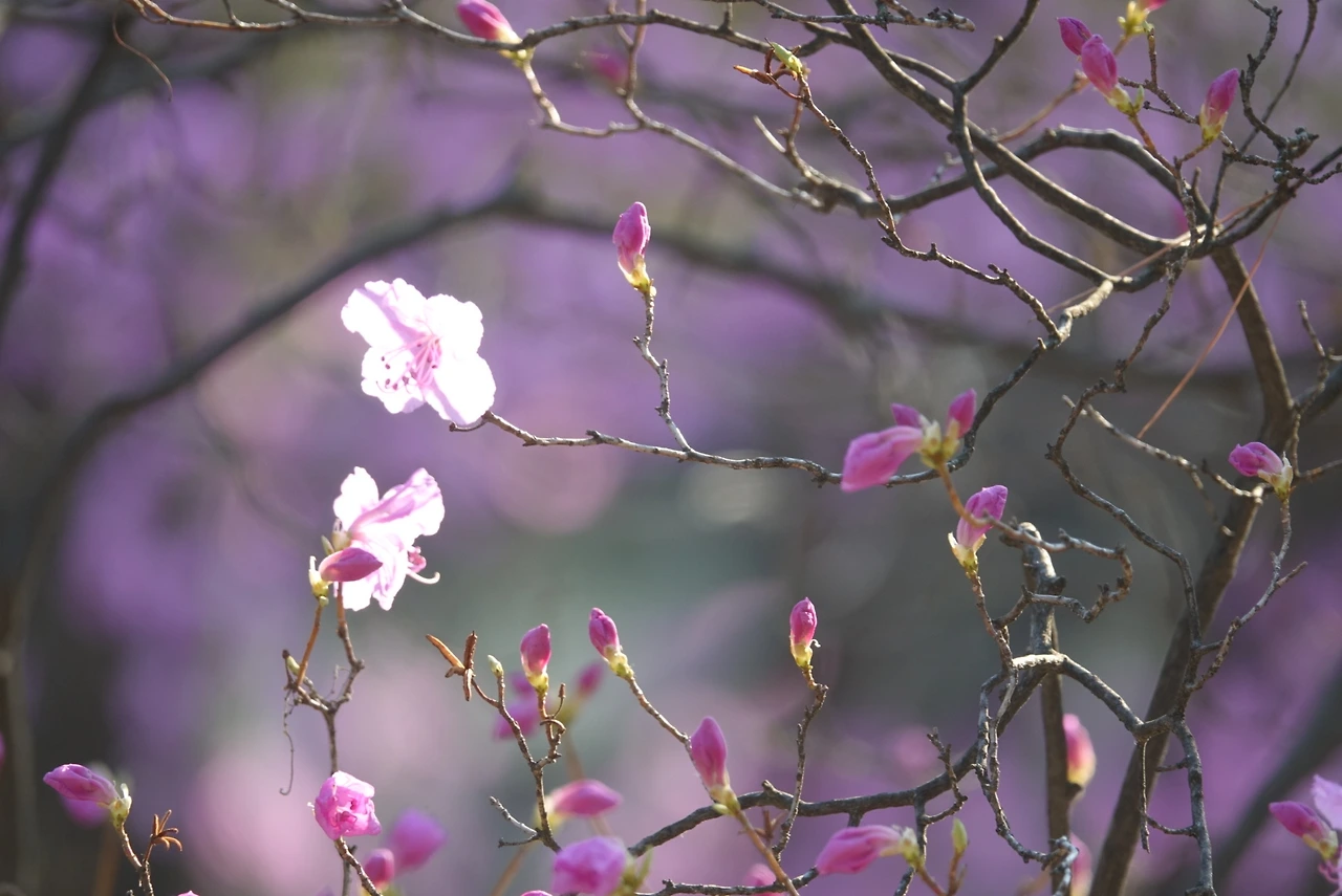 막 피어나는 진달래꽃을 찍은 사진이다. 무대에 선 스타에게 스포트라이트가 비치듯 햇빛이 꽃을 비추고 있는 모습이 눈에 들어왔다. 위치를 계속 바꾸며 배경을 고르다가 이 위치에서 정지했다. 이 배경이 진달래꽃의 개화를 가장 생생하게 살려주고 있다고 생각해서이다.
