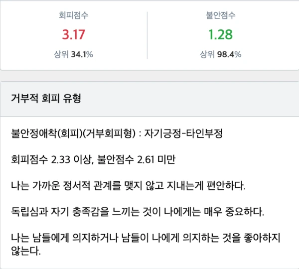 제가 어떤 사람인지 알아야 단점을 고치려고 노력할 수 있지 않을까 생각했고 검사 결과 회피형이라고 나왔습니다. 설명 내용을 읽어보고 인터넷에서 찾아보니 회피형이 맞는 거 같았습니다. (안정형이 나올 줄 알았지만)