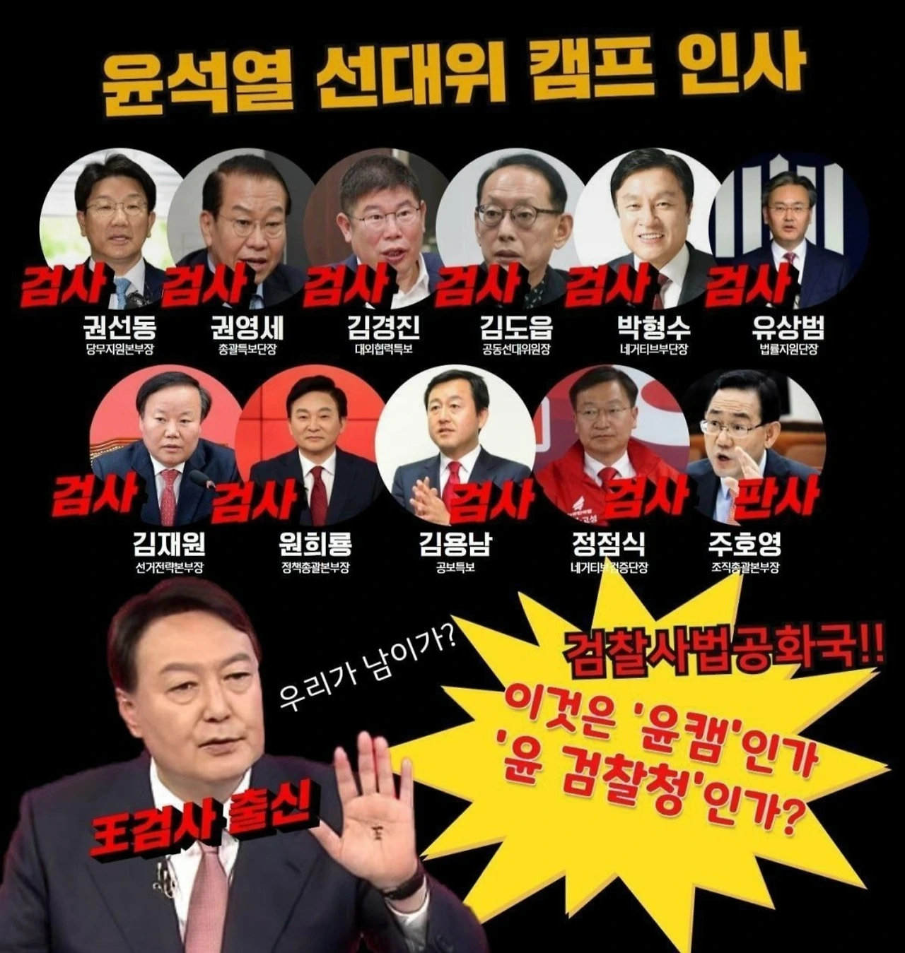 이렇게 간부급 실무진들이 거의 다 검사 출신이니 윤석열 후보가 대선에서 승리했을 경우 '검찰공화국'이 될 것이라는 세간의 우려가 전혀 근거 없는 말이 아니다. 과거 박정희, 전두환ㆍ노태우 군사 정부의 최측근인 정무 보좌 라인과 참모들이 거의 대부분 군 출신으로 군사독재정권의 쿠데타의 주역으로 정권의 전위대 역할을 한 전례를 봐도 검사들로 이루어진 검찰 독재정권이 탄생하지 않는다는 보장이 없다는 것이다.