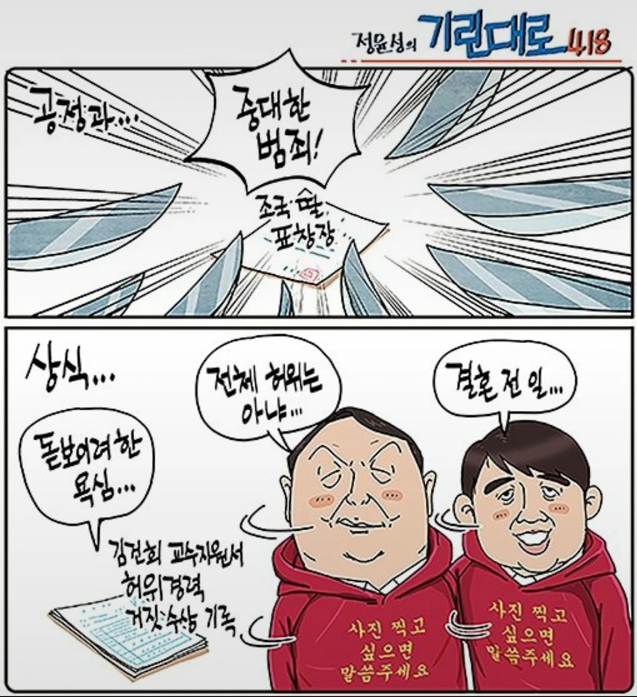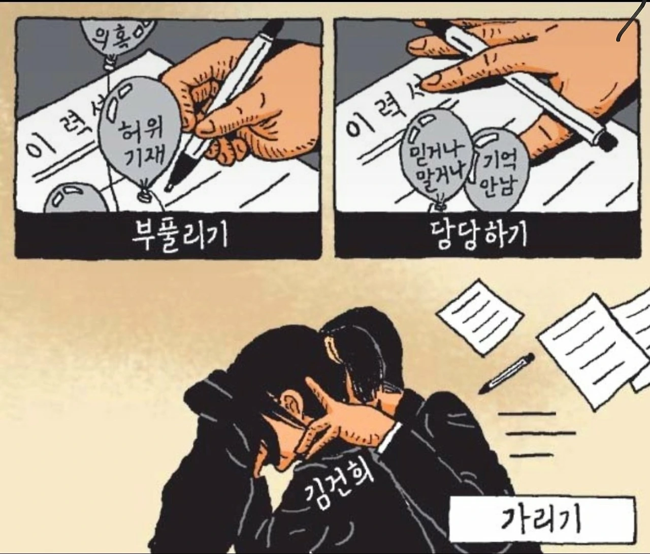 허위 경력 기재 논란에 대해 "학교 진학을 위해 쓴 것도 아닌데 무슨 문제냐?"라는 김건희 씨의 논리 대로라면 그럼 대학에 교수로 들어가는 건 괜찮고 학생으로 들어가는 건 문제란 말인가?