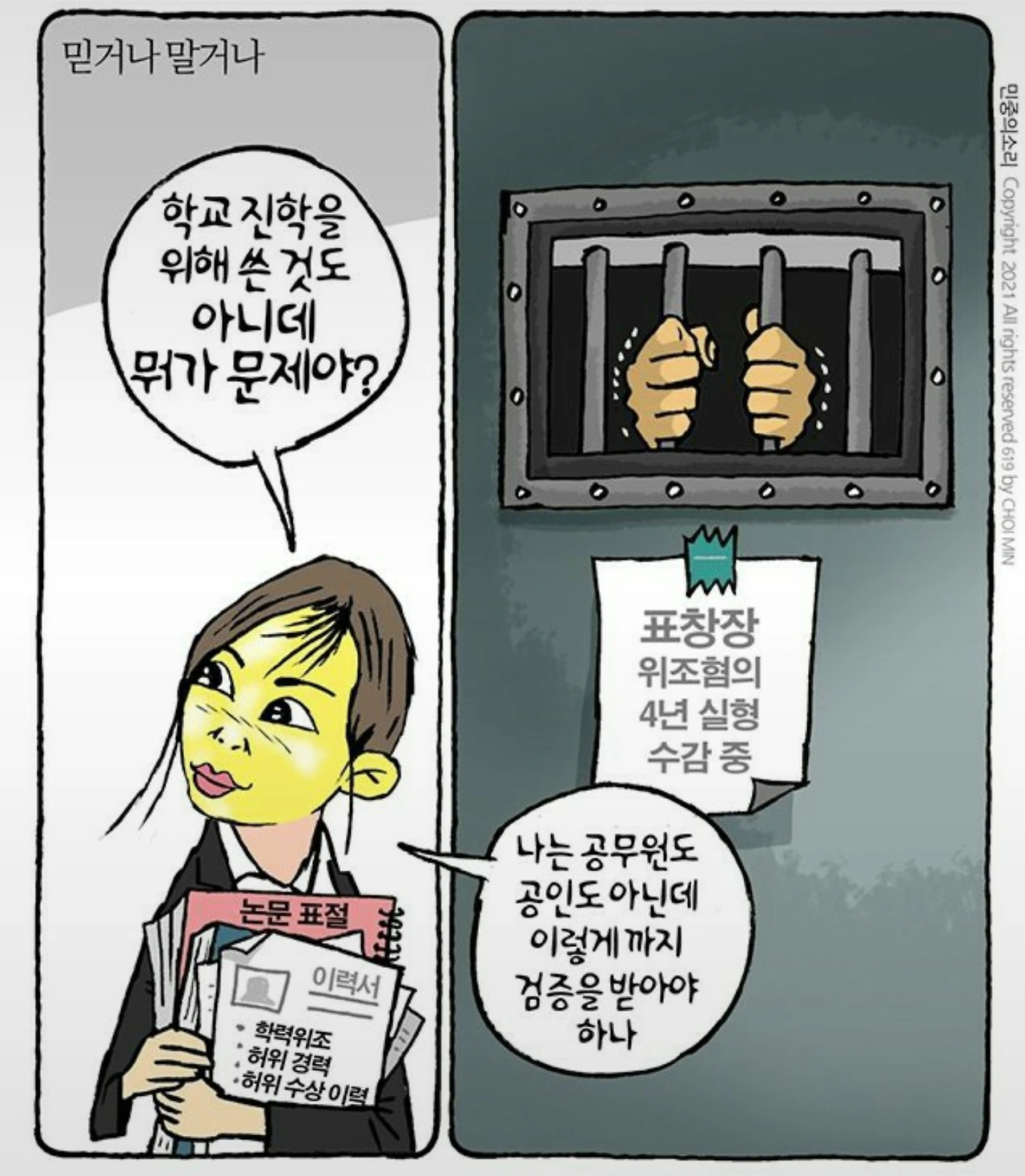사문서 위조 건이 나와서 말인데 정경심 교수는 대학 입학의 당락에도 전혀 영향을 끼치지 못한 10년 전 동양대 봉사활동 표창장 하나로 인해 검찰의 수십 차례의 압수수색을 당해야 했으며 위조와 관련한 내용으로 사문서 위조, 위조사문서 행사 등의 비슷비슷한 혐의로 기소가 되었고, 이어 34회에 걸친 공판을 거쳐 검찰에 의해 징역 7년형을 구형받았으며 재판부는 이에 징역 4년을 선고했다.