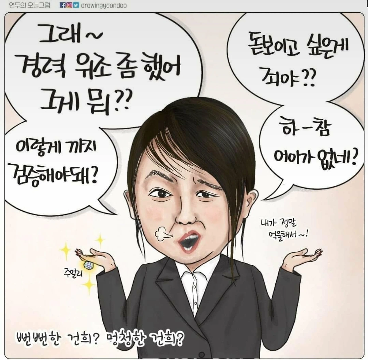 남편이라서 부인을 편들고 면죄부를 주고 싶은 마음은 알겠는데 이런 범법 행위마저 두둔하며 하물며 우리나라 법 집행기관의 수장이었다는 자가 할 말은 더욱 아니지 않나? 더군다나 그렇게 법치와 공정을 부르짖던 이가 말이다.