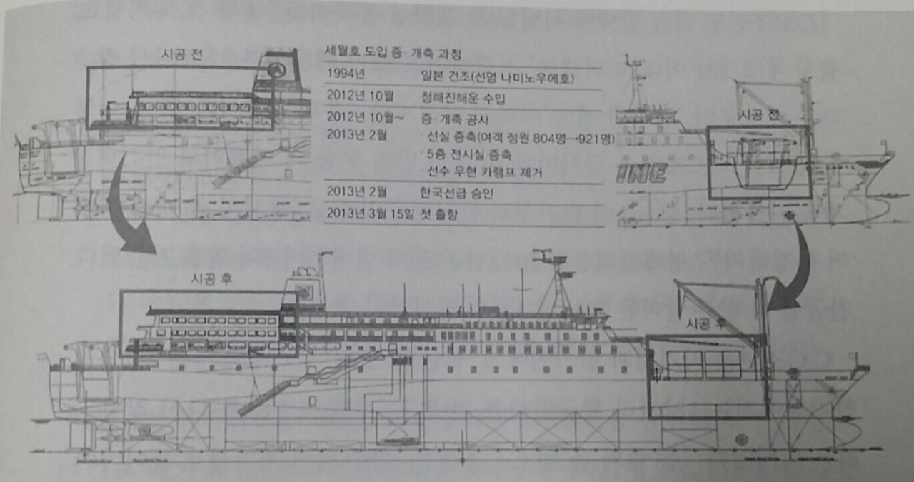 청해진 해운의 세월호 불법 증ᆞ개축한 과정 설명도/ 청해진 해운 사건 2심 판결문(2015.05.12)65~66쪽. @그래픽 디자인(주), 세월호, 그 날의 기록(2016)p479이상과 같이 청해진 해운의 세월호 선박 도입의 배경과 과정에서 보듯이 과거 MB 정권은 헌법 제34조 ⑥항의 재난으로부터 국민의 생명을 보호해야 하는 정부의 책무를 저버리고 안전규제를 완화하고 한국 선업과 관련한 국가 안전 업무를 민간에게 위탁케 하는 등 극단적인 자유방임형 시장경제 체재의 '신자유주의 정책'을 밀고 나가 대기업 위주의 친 기업 경제 성장 정책을 노골적으로 추진해 왔다.
