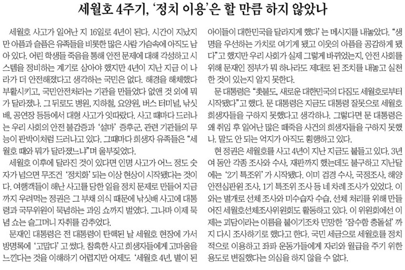 지난 16일 세월호 4주기 때 <조선일보>는 '세월호 4주기, ‘정치 이용’은 할 만큼 하지 않았나 '라는 사설을 통해 “여행객들이 해난 사고를 당한 일을 정치 문제로 만들어 지금까지 우려먹는 정권"등으로 현 정부를 비판하고 하며 세월호선체조사위원회(이하 선조위)에 대해서도 "국민 세금으로 세월호를 정치적으로 이용하고 좌파 운동가들에게 자리와 월급을 주기 위한 용도로 변질했다는 의심을 하지 않을 수 없다"라고 비난했다. <동아일보> 또한 같은 날 '합동분향소 철거 이어질 세월호 4주기의 추모와 다짐'이라는 사설을 통해 “합동분향소 철거에 맞춰 서울 광화문 광장의 세월호 천막도 정리할 때”라고 주장하였다.