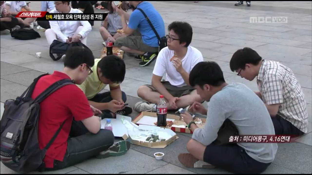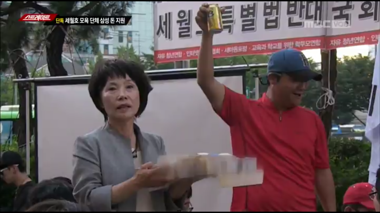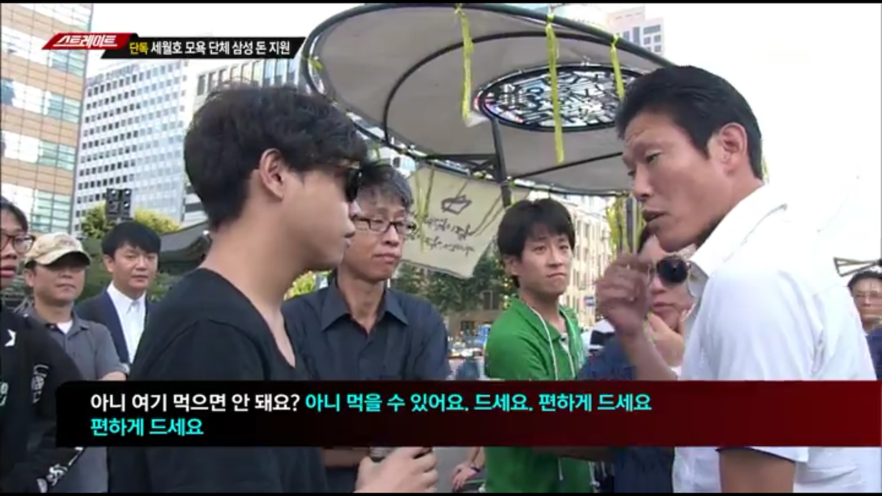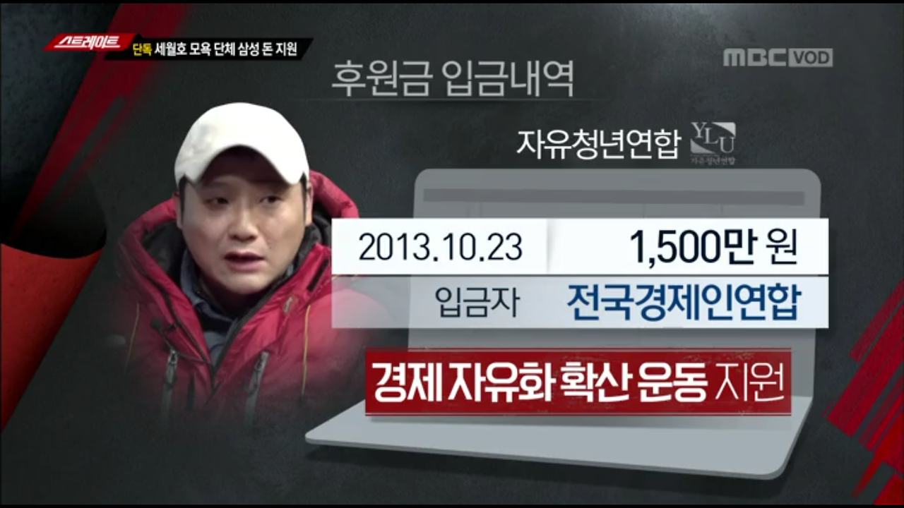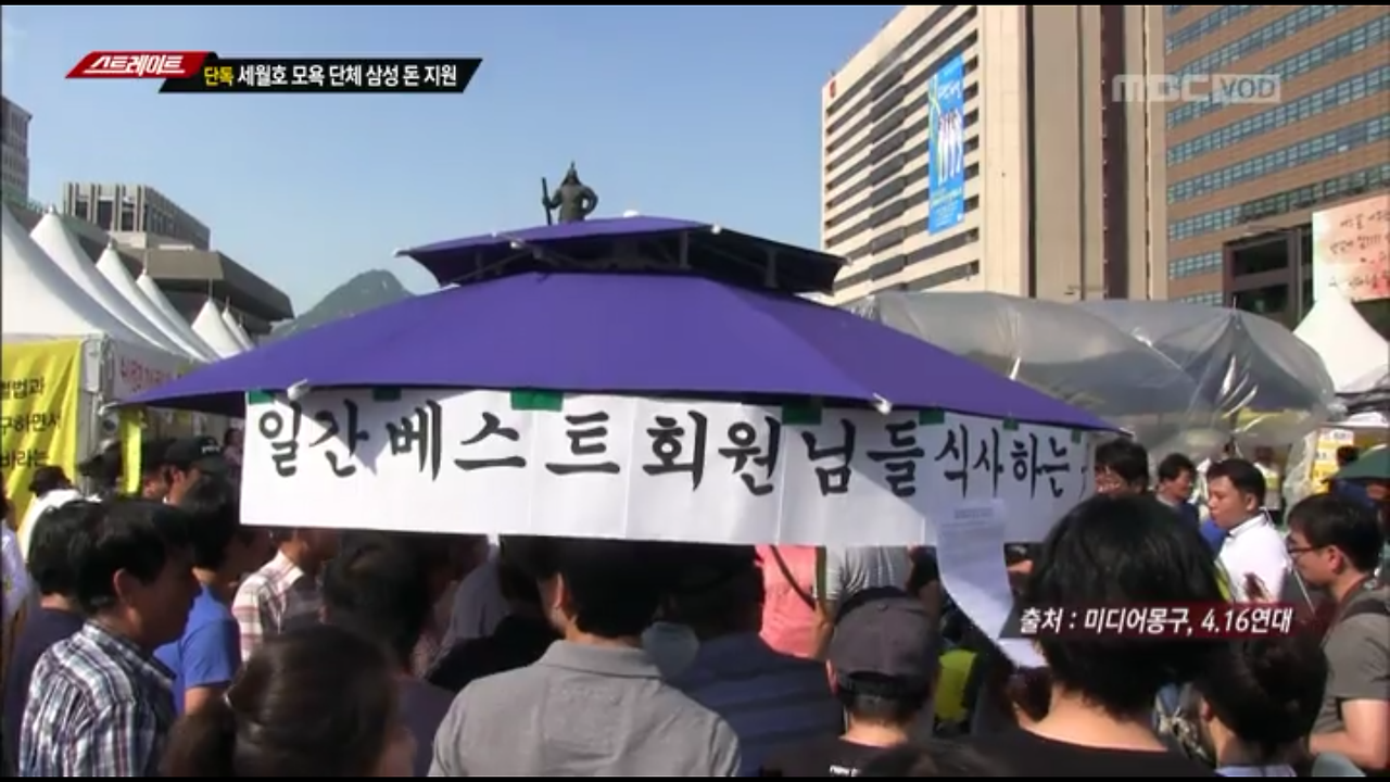 일베 등 보수단체 회원들이 세월호 유가족의 단식 농성을 조롱하며 음식을 나눠주고 먹고있다. @ MBC 탐사보도 여기까지는 이제까지 언론의 보도로 잘 알려진 사실이다. 하지만 지난달 22일 MBC의 탐사 기획보도 프로그램인 <스트레이트>에서 보도한 바에 따르면 이들을 지원해 준 단체가 전국경제인연합회(이하 전경련)이고 그 배후에는 삼성과 당시 청와대가 있었음을 밝히고 있다.