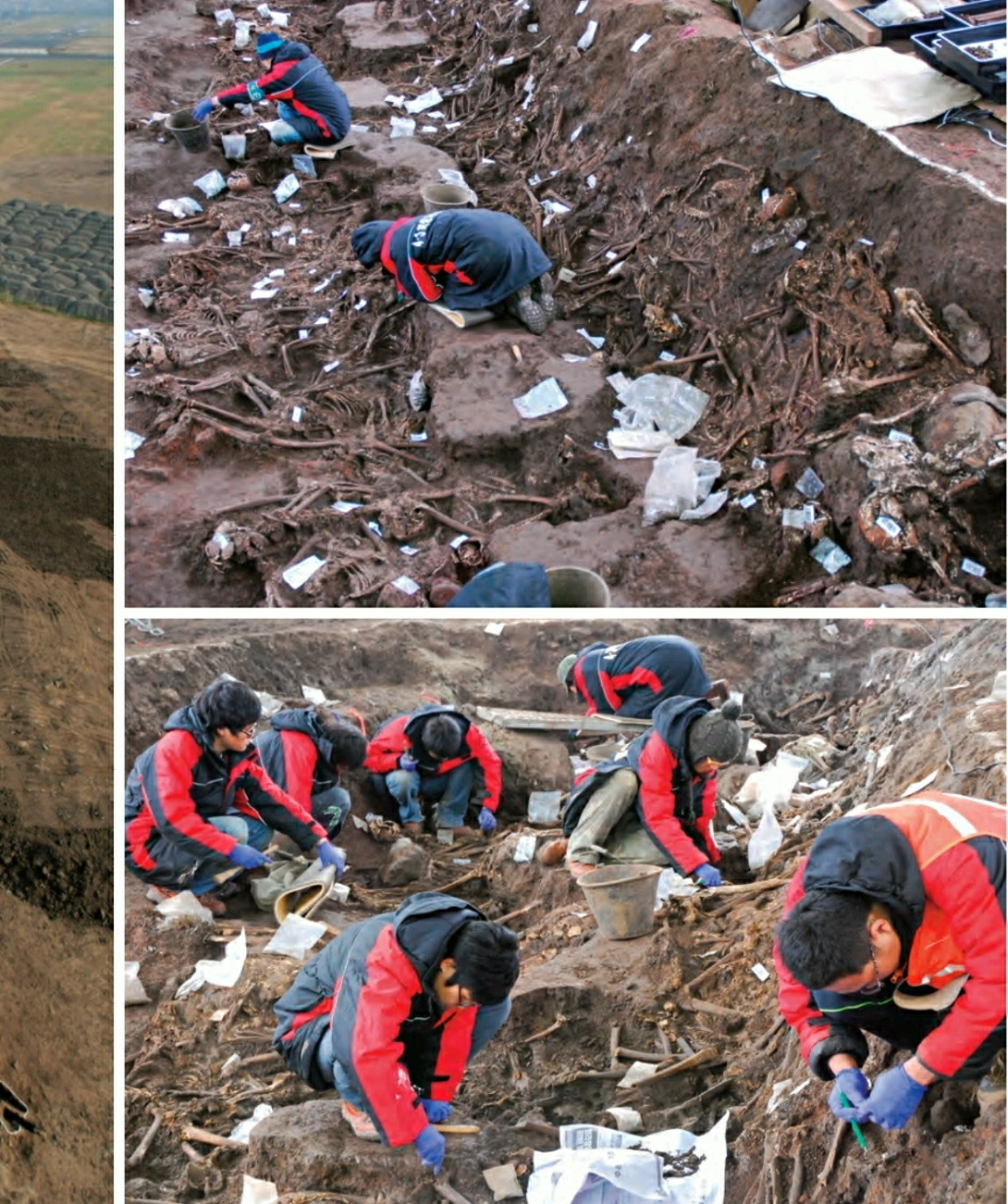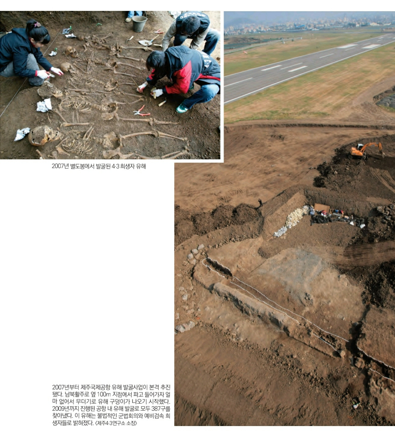 ▲ 2007년 별도봉(좌)과 제주공항의 유해발굴작업 현장(우), 공항에서 총387구가 발견되었고 이 유해는 불법적인 군법회의와 예비검속 희생자들로 밝혀졌다./제주4.3 연구소 소장