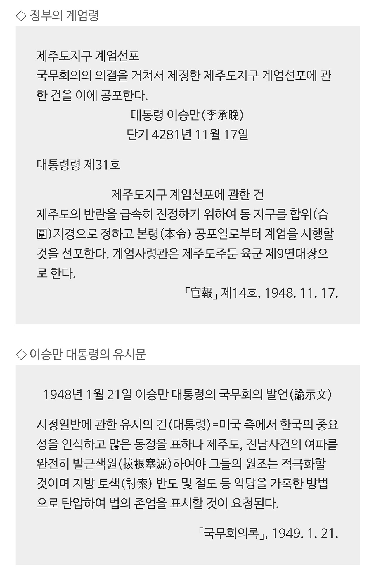 1948년 당시 제주 4·3 사건을 완전히 진압해야 미국의 원조가 가능하다고 생각한 이승만은 제주도에 대한 가혹한 탄압을 지시했다. 이 지시는 '초토화 작전'이 미국과의 교감 속에 진행됐음을 암시하고 있다. 미ㆍ소 냉전이 심화되는 가운데 아시아 지역에 방벽을 구축하겠다는 미국의 의지가 반영된 것이었다.