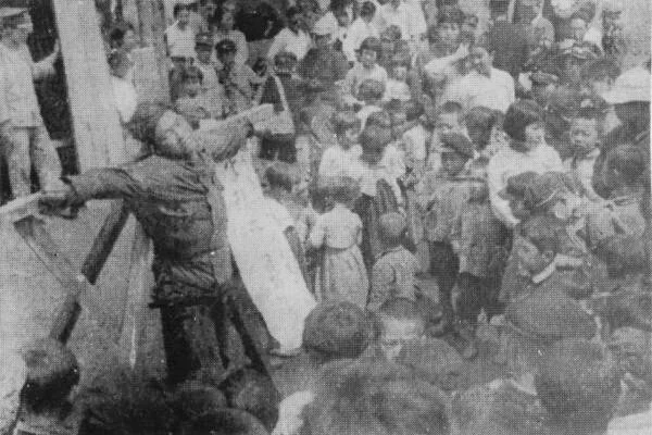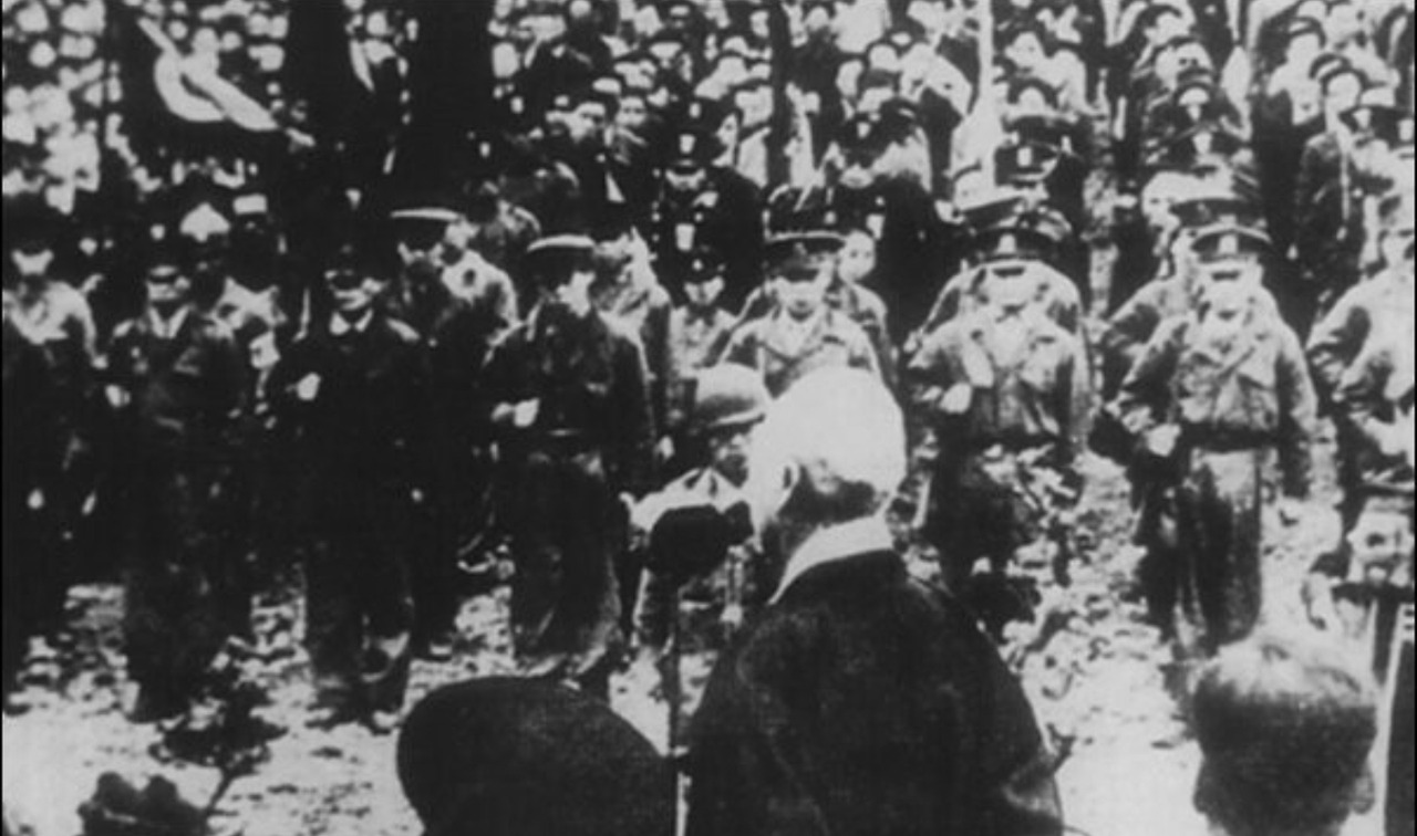 ▲ 제주도에 출동하는 경비대 대원들을 격려하는 이승만 ⓒ제주4.3사건 진상보고서.1948년 12월 20일 대전에서 200명으로 서청 '특별 중대'가 편성되었다. '특별 중대'는 소대 단위로 이곳저곳 옮겨 다니며 토벌전을 벌였다. 군번 없이 경비대 복장을 한 특별 중대는 주로 성산포 일대에 주둔, 애매한 사람들까지도 '때려잡는 일'을 했다. 1949년 1월 13일 성산포 앞바다에서 28명의 고성리 청년들을 집단 학살했다. 이 무렵 국민학교 교사 6명도 총살됐다.