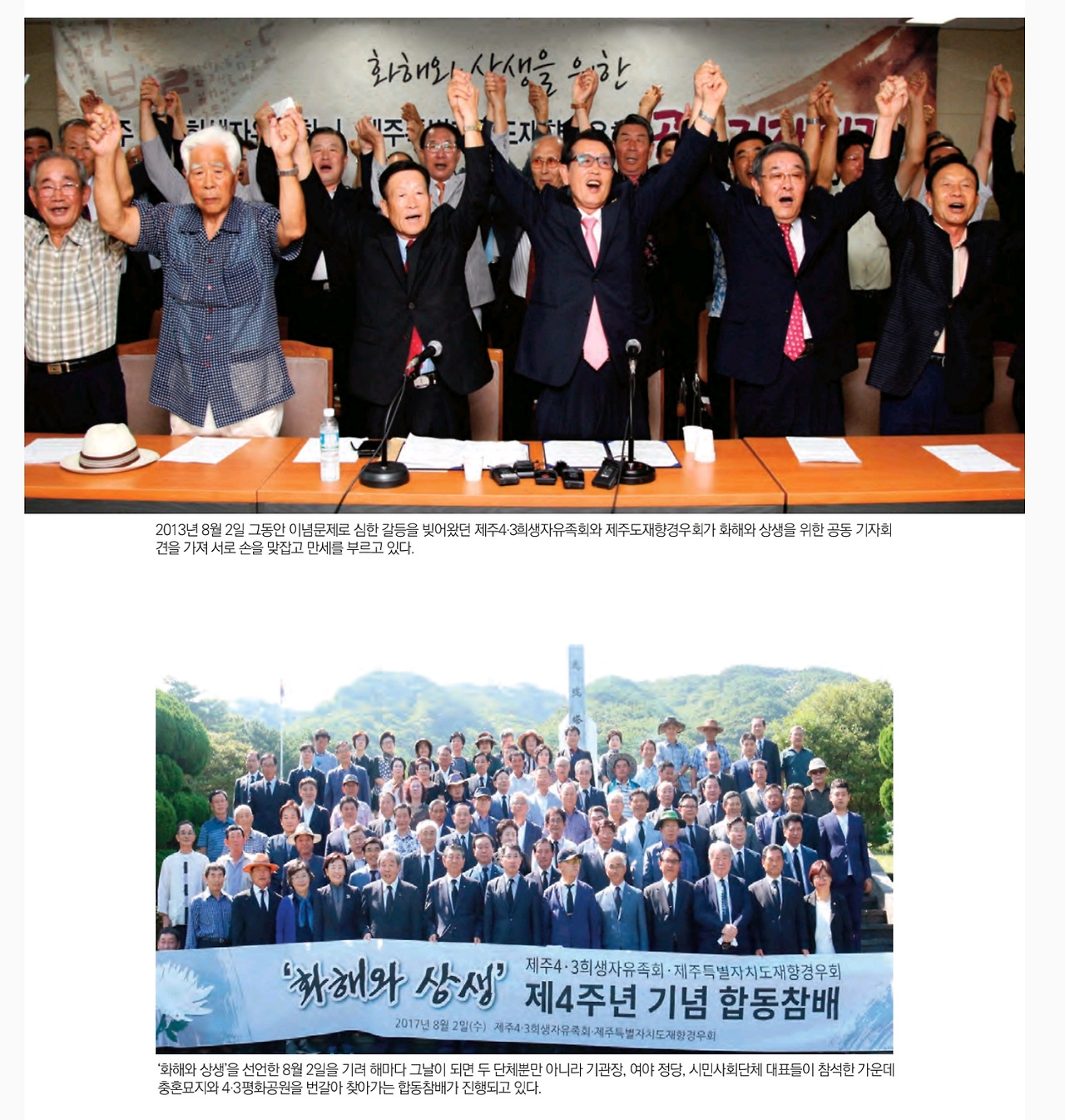 지난 2013년 그동안 이념 문제로 갈등과 반목을 겪어왔던 제주 4.3 희생자 유족회와 제주도 재향경우회가 4.3 사건 발발 65년 만에 화해와 상생을 자리를 만들었듯이,