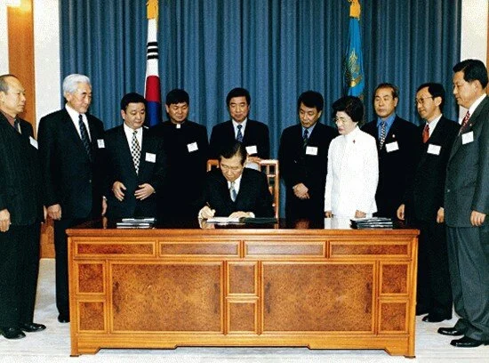 ▲2000년 1월, 김대중 전 대통령이 제주 4.3 특별법에 서명하고 있는 장면/ ⓒ공감신문, 노무현 대통령이 4.3위령제에 참가해 묵념하고 있다(2006.4.3)/ⓒ미디어제주