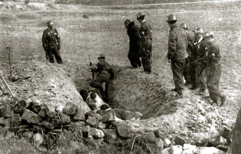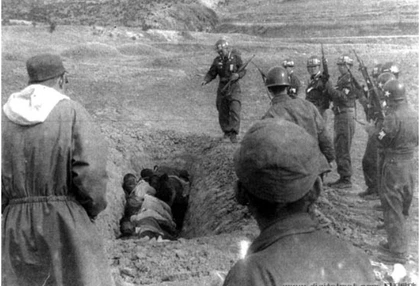 ▲보도연맹 사건 당시 무고한 양민들을 끌고와 구덩이에 파묻고 학살하는 자료 사진 <출처: 미국이 기밀 해제한 문서, by 미군 애버트 소령>또한 4.3 사건 당시 학생이었던 1940년 애월읍 태생인 '장정훈(張禎薰)씨'는 애월 국민학교에서 벌어진 총살을 목격한 경험담을 이렇게 증언하고 있다.