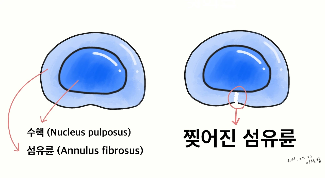 디스크의 수핵이 섬유륜을 통해 터져 나오는 디스크 탈출증의 전 단계로 이해하면 되겠습니다.