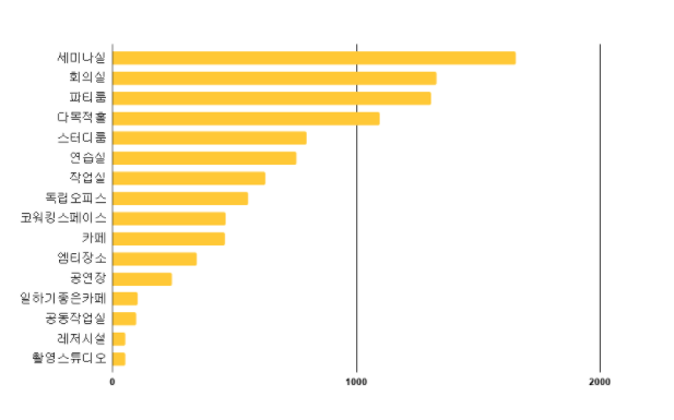 세미나실(1,654개), 회의실(1,328개), 파티룸(1,307개) 순으로 밀집되어 있는 것을 알 수 있습니다.