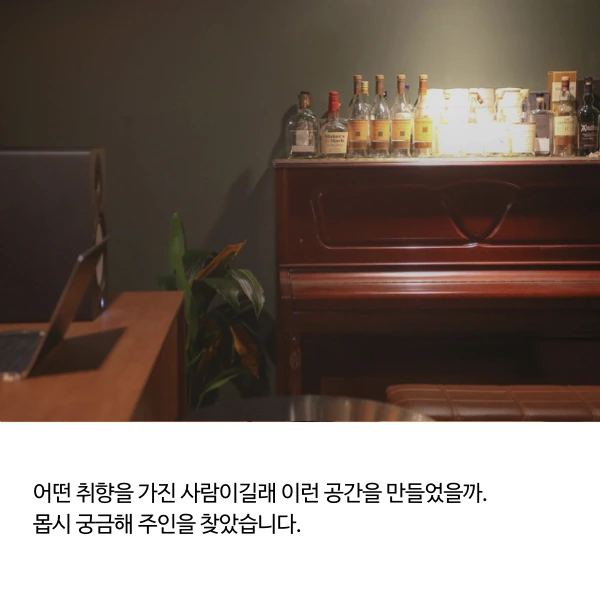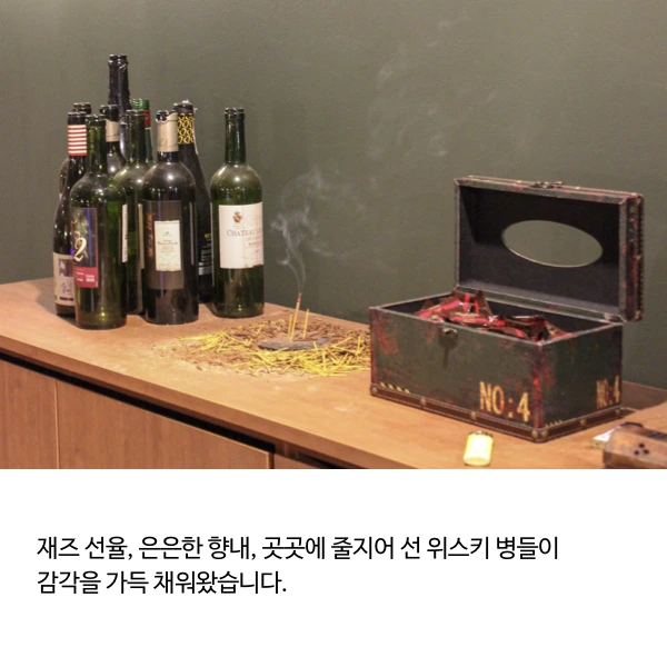 재즈 선율, 은은한 향내, 곳곳에 줄지어 선 위스키 병들이 감각을 가득 채워왔습니다.