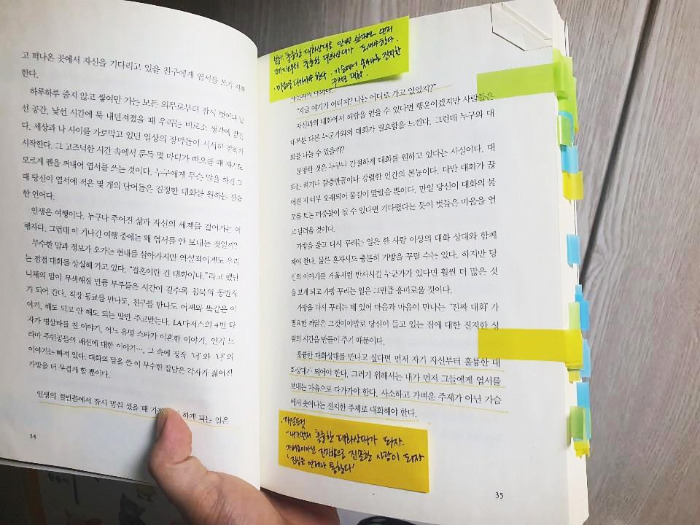 나중에 이 책을 다시 펴게 되는 날이 올지도 모른다. 다시 읽게 될 수도 있다. 포스트잇을 통해 과거와 현재의 내가 다시 만나 감정을 나누고 있을 것이다. 책을 읽은 바로 다음의 감정의 기록은 ‘날 것’의 느낌이 나는 생생하기에 무척이나 소중하다.