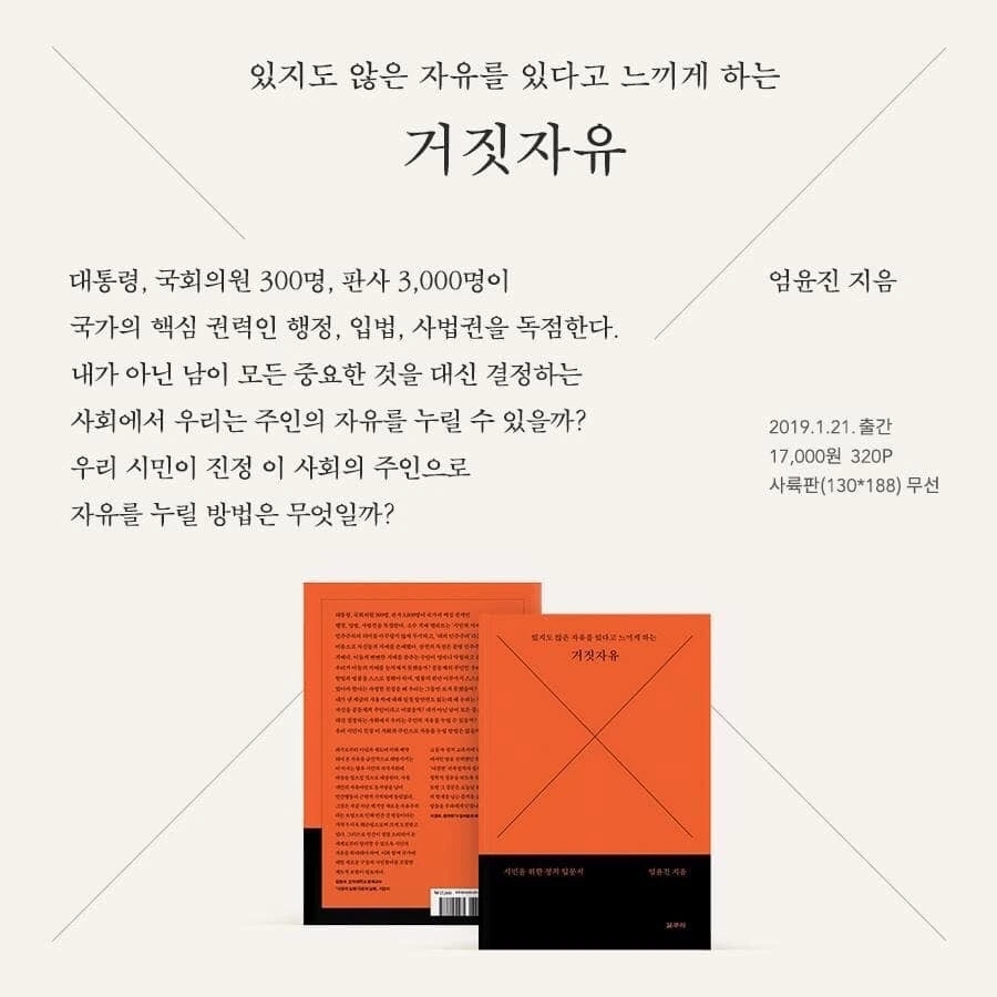 이 균열의 틈에 미련 없이 정을 들이댄 책이 <있지도 않은 자유를 있다고 느끼게 하는 거짓 자유>다. 어렴풋이 한글에 눈떠가는 어린아이처럼 나는 이 책을 읽고 비로소 내가 가지게 된 이 의심과 배신감의 실체를 분명하게 확인하게 되었다. 이 말이 절대 과장이 아니라고 할 만큼 이 책은 헬 조선이 된 현재의 대한민국을 적나라하게 투시하고 우리의 눈을 가리고 이념이 된 대의제 민주주의의 허상을 낱낱이 까발려준다.