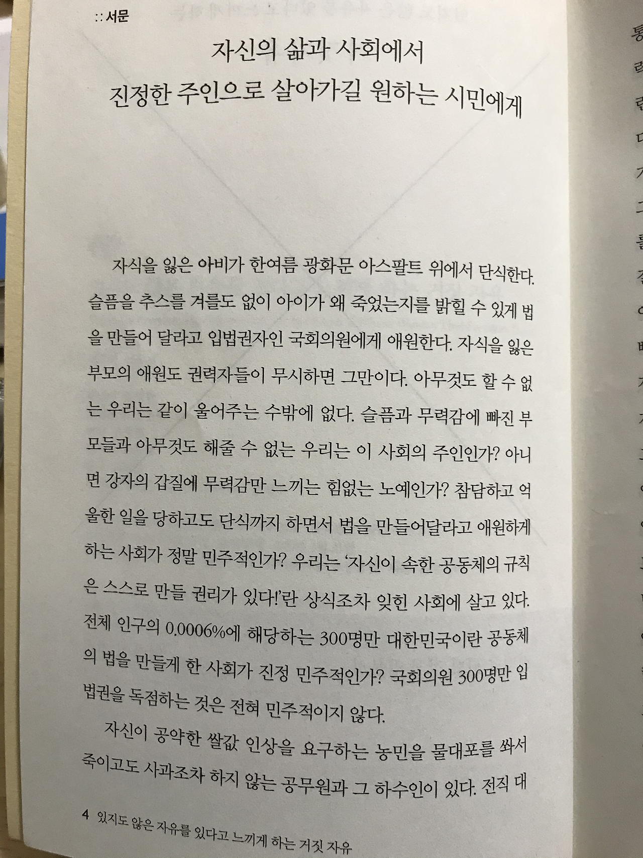 세월호 유민이 아빠도, 그리고 민식이 부모도 국회의원 앞에서 무릎 꿇거나 땡볕에 단식했다. 이런 어이없고 한탄스러운 일이 반복된다. 입법권을 독점한 자들의 횡포와 비정함에 맞설 수 있는 가장 효과적인 방법은 권력의 주인인 시민 스스로 입법권을 가지는 거다. 어떤 지식인도, 김어준 같은 유력한 방송인도 매번 일어나는 이런 슬픈, 시민이 비참하게 무시당하는 사건 즉, 현상만을 보도한다. 그리고 투표 잘하라고만 한다. 주권자인 시민이 이렇게 무력감만 느끼게 하는 일을 투표만 잘하면 정말 해결할 수 있을까? 세월호부터 민식이법까지 주권자인 시민이 법을 만들 권리를 위임한 하인(civil servants; 공무원)인 국회의원에게 반복해서 무릎 꿇었다. 시민 편에 서 있다는 유력한 사람들은 이런 비참하고 어이없는 상황을 만드는 근본 원인에 대해서는 정말이지 완벽하게(?) 관심이 없다.