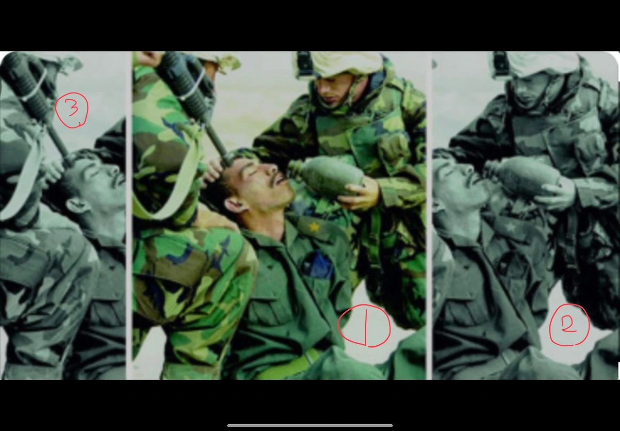 아래 사진(군인 사진) 2번과 3번을 독자가 볼 때 일어나는 감정과 생각이 확연히 달라질 거다. 하지만 전체 사진은 1번이다. 언론과 스핀 닥터(political PR/ spin doctors)가 쓰는 프레임은 바로 자신들의 의도대로 2번과 3번 중에 하나를 골라 쓴다. 전체 그림인 1번은 대중에게 보여 주지 않고.