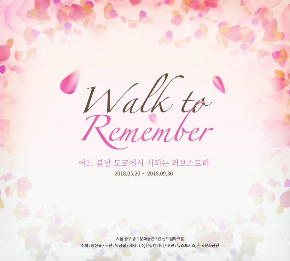 저희는 대학로에 위치한 '앙상블'이라는 연극단입니다. 극단에서 주최하는 연극 'Walk to Remember'의 포스터 제작을 의뢰합니다. 연극의 스토리는 어느 봄날 도쿄에서 시작됩니다. 흐름의 주요 매개체는 나뭇가지와 그 끝에서 떨어지는 꽃잎입니다.