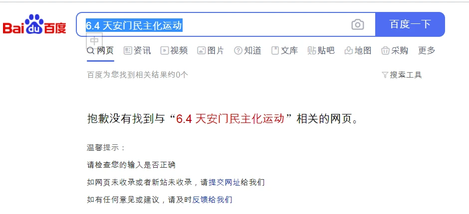 사진설명 : 2021년 7월 19일 중국 최대의 포털인 百度(baidu.com)에서 6.4 천안문민주화 운동을 검색한 결과. 아무것도 검색되고 있지 않다.