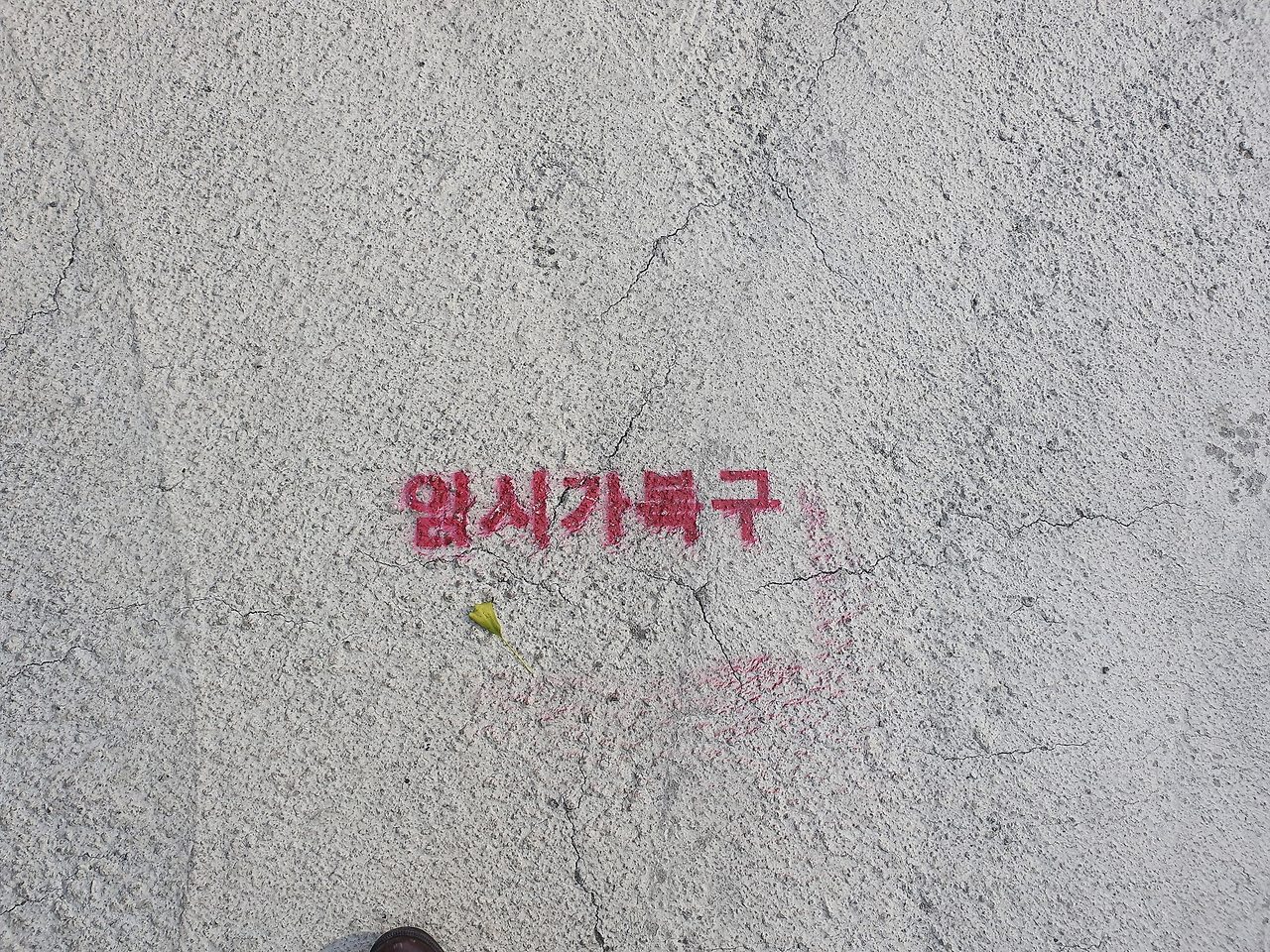 그런데 가만히 살펴보니 보도블록이 제대로 깔린 곳이 있고 시멘트로 대강 덮어 놓은 곳이 있으며 이 글은 시멘트 포장 위에 여러 곳 찍혀 있었다. 그렇다면 아마도 '공사 중에 임시(臨時)로 잠깐(假) 해 놓은 것이니 공사 끝나면 제대로 다시 보도블록 깔아 놓겠다' 정도의 의미를 전하기 위해 '임시가복구'라고 써 놓은 것 같다.