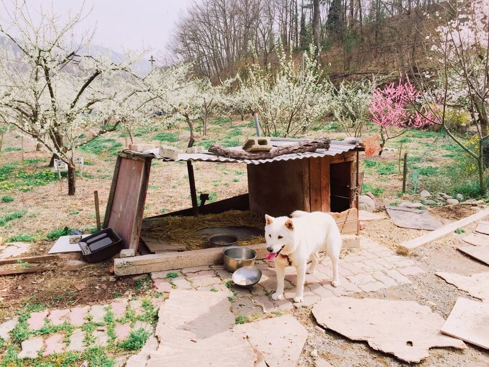 시골집 봄 사진이다. 보름이(개) 뒤로 자두꽃이 만발해 있다.