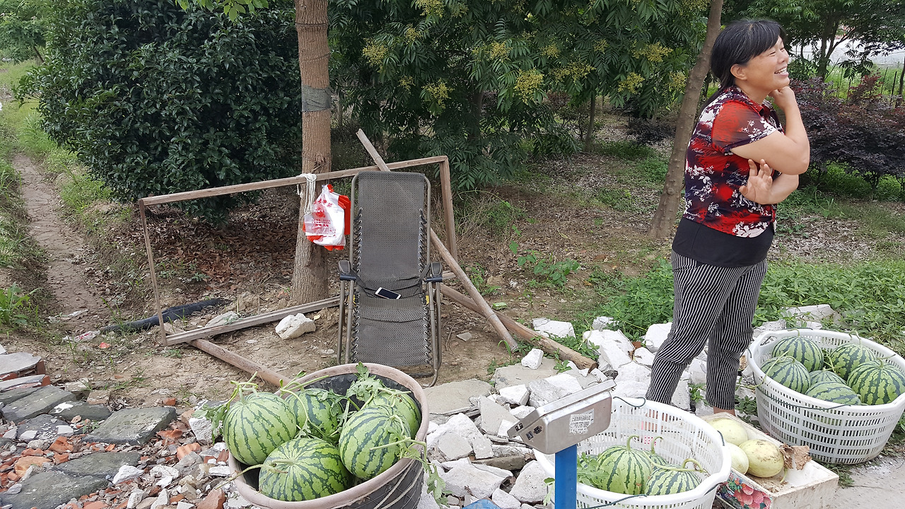 ** 아래 사진은 항주 교외에서 수박 노점을 하시는 '항주 아줌마'이다. 중국에서는 수박을 한 개에 얼마가 아니라 한 근에 얼마, 즉 무게를 기준으로 팔기 때문에 항상 저울이 필요하다. 중국의 비약적인 경제 발전은 노점 수박 장사도 디지털 저울을 사용하기에 이르렸다.