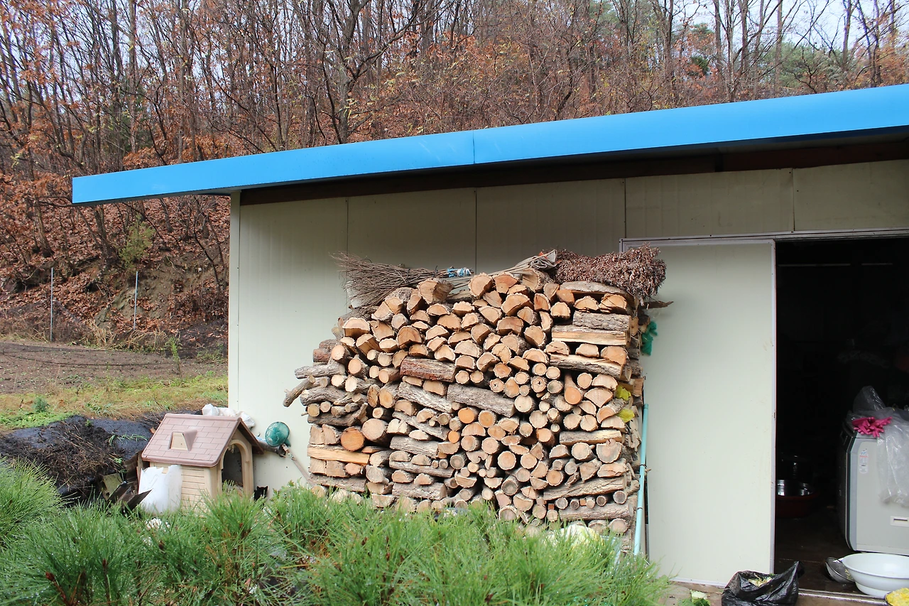 창고 안에 참나무 장작을 쌓고 공간이 모자라 창고 밖에도 쌓았다.