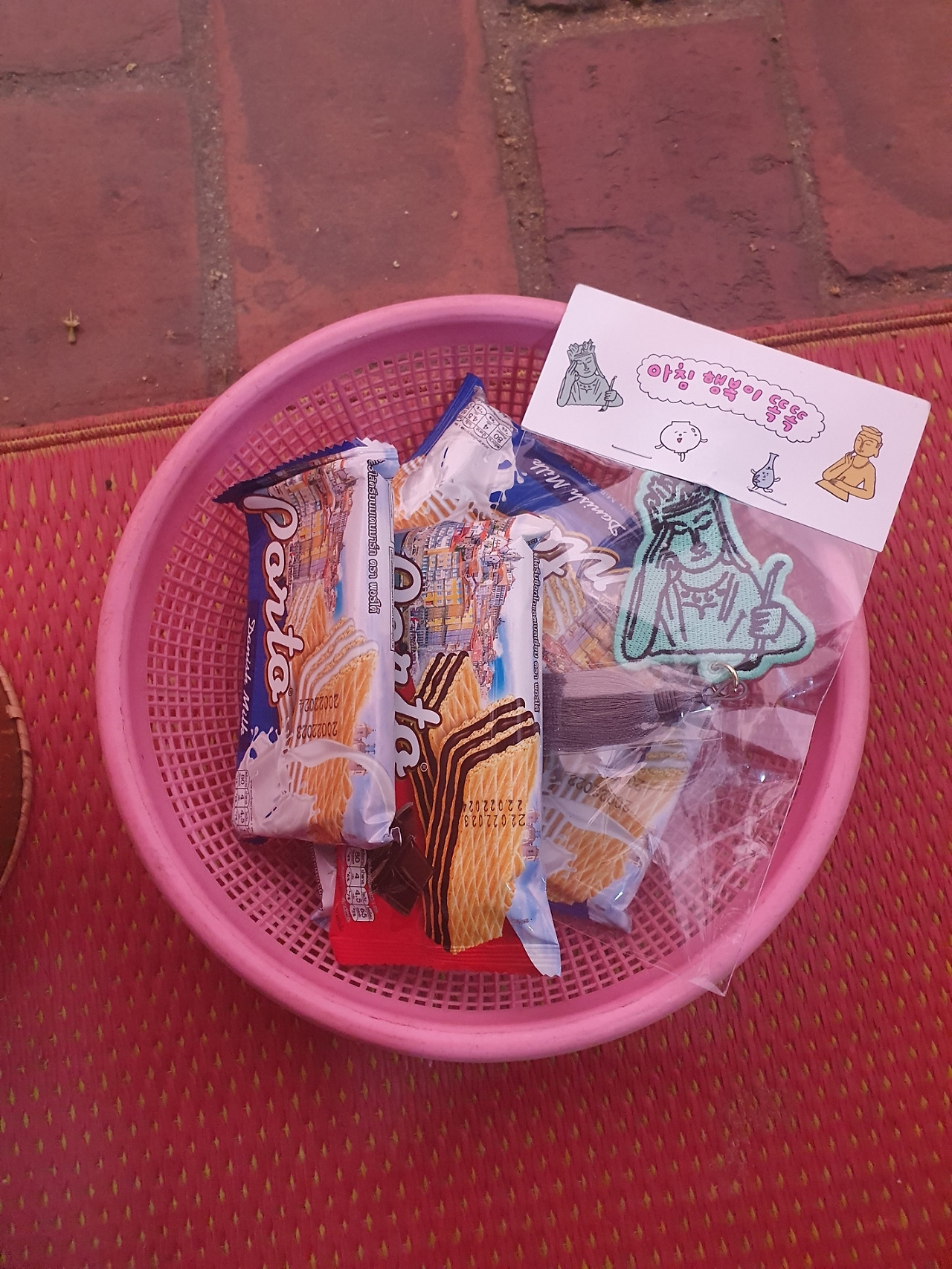 이번에 미리 준비했다. 차분히 앉아 보시 올릴 찰밥을 미리 덩어리지게 준비했다. 승려의 발길보다 늦지 않게 발우에 넣어야 한다. 과자도 순서대로 집을 수 있도록 챙겼고 서울에서 가져간 ‘생각하는 부처님’도 따로 건사했다.