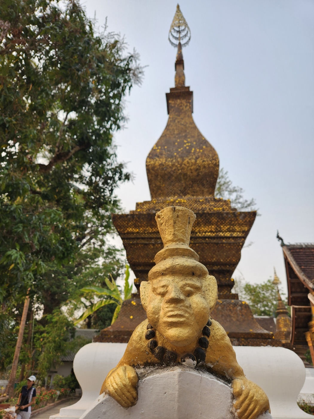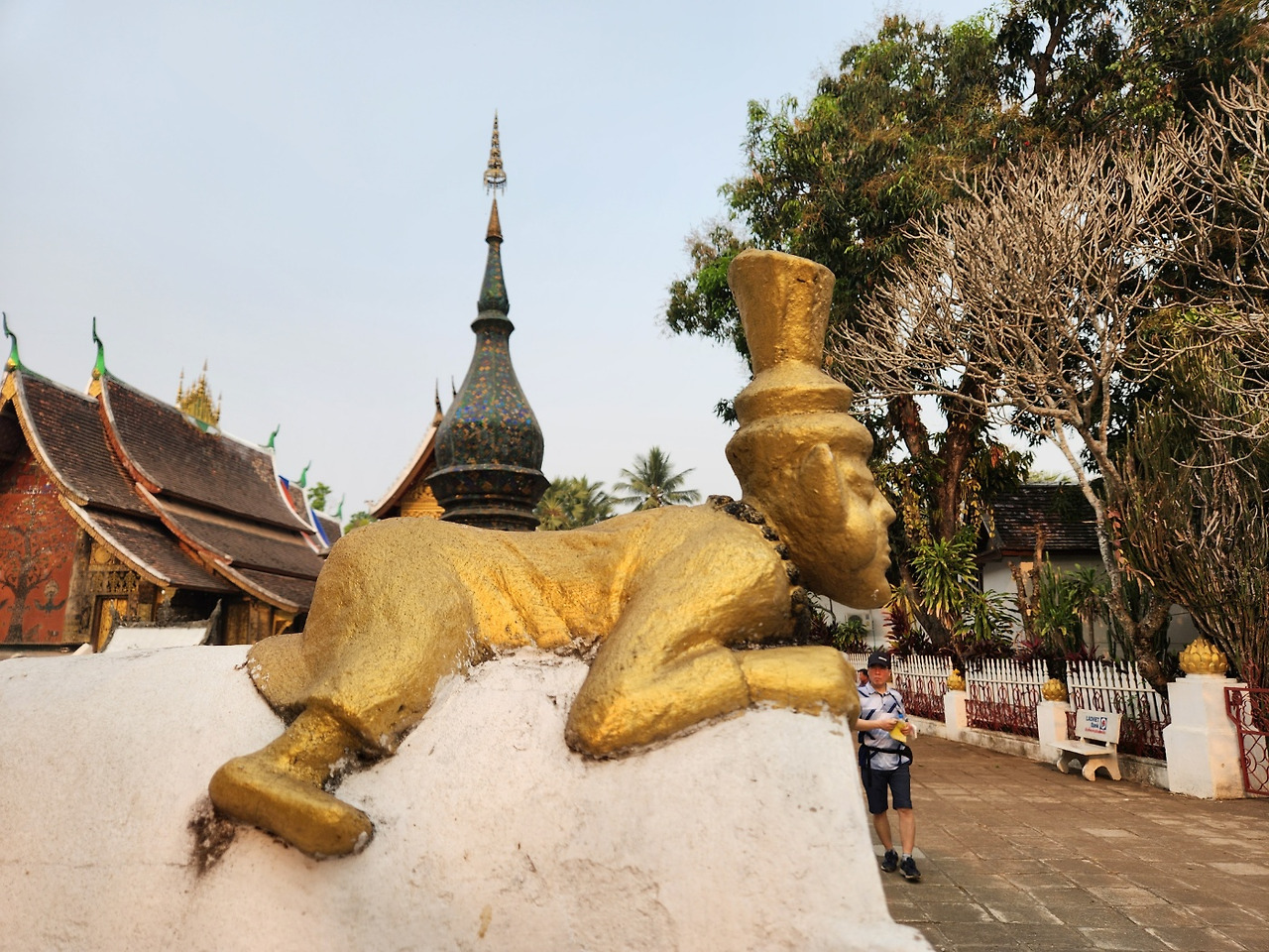 처자식을 거느린 놈이 집 밖에 나왔다고 실없는 생각을 하다니! 영락없는 도둑놈 심보다. 그런데 사원에 도둑놈 상도 있었다. 그는 실크햇(silk hat)을 쓰고 멋진 연미복을 입은 채 담을 넘고 있다. 멋진 신사가 루앙 프라방의 사원에 숨어들은 이유가 뭘까? 증거는 그가 염주 도둑이라고 말하고 있다.