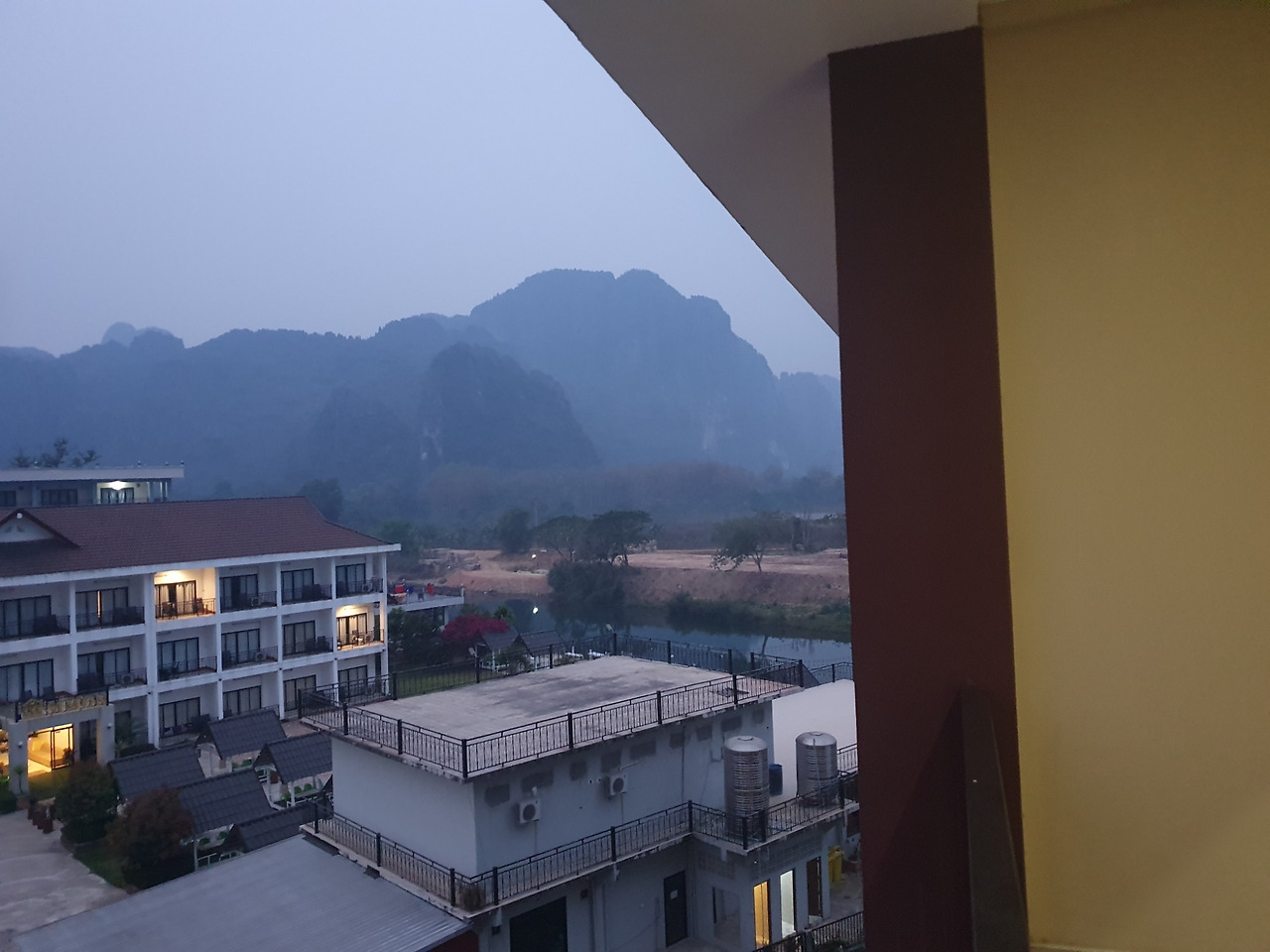 숙소 창으로 바라본 방비엥. 침대가 삐걱거리는 숙소는 오랜만이었다.
