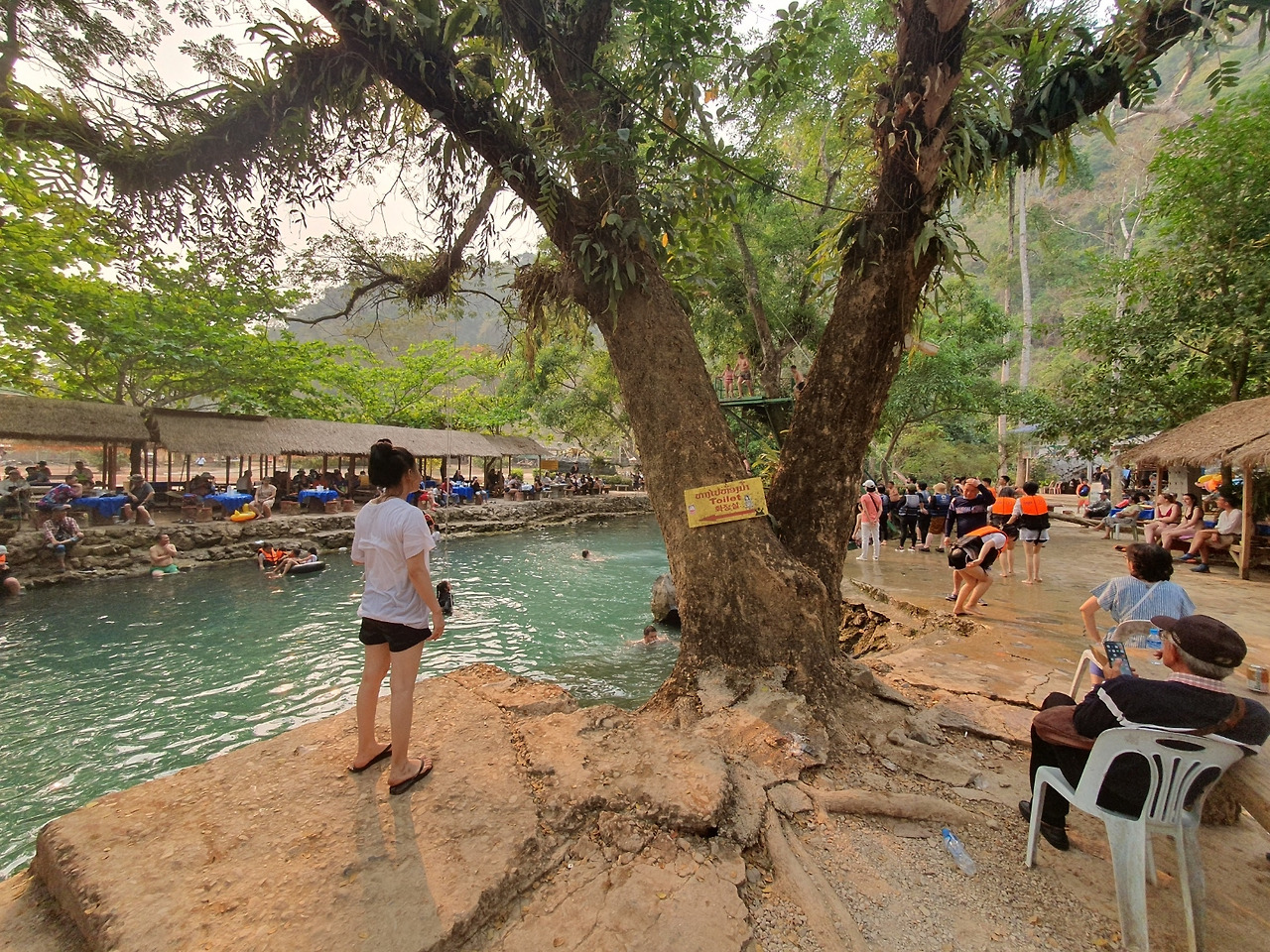 TV에 많아 나온 곳이다. 멀리 다이빙하려는 사람이 나뭇가지 위에 올라간 것이 보인다. 사람이 들이 수영하는 곳을 '화장실' 팻말이 가리키고 있다.