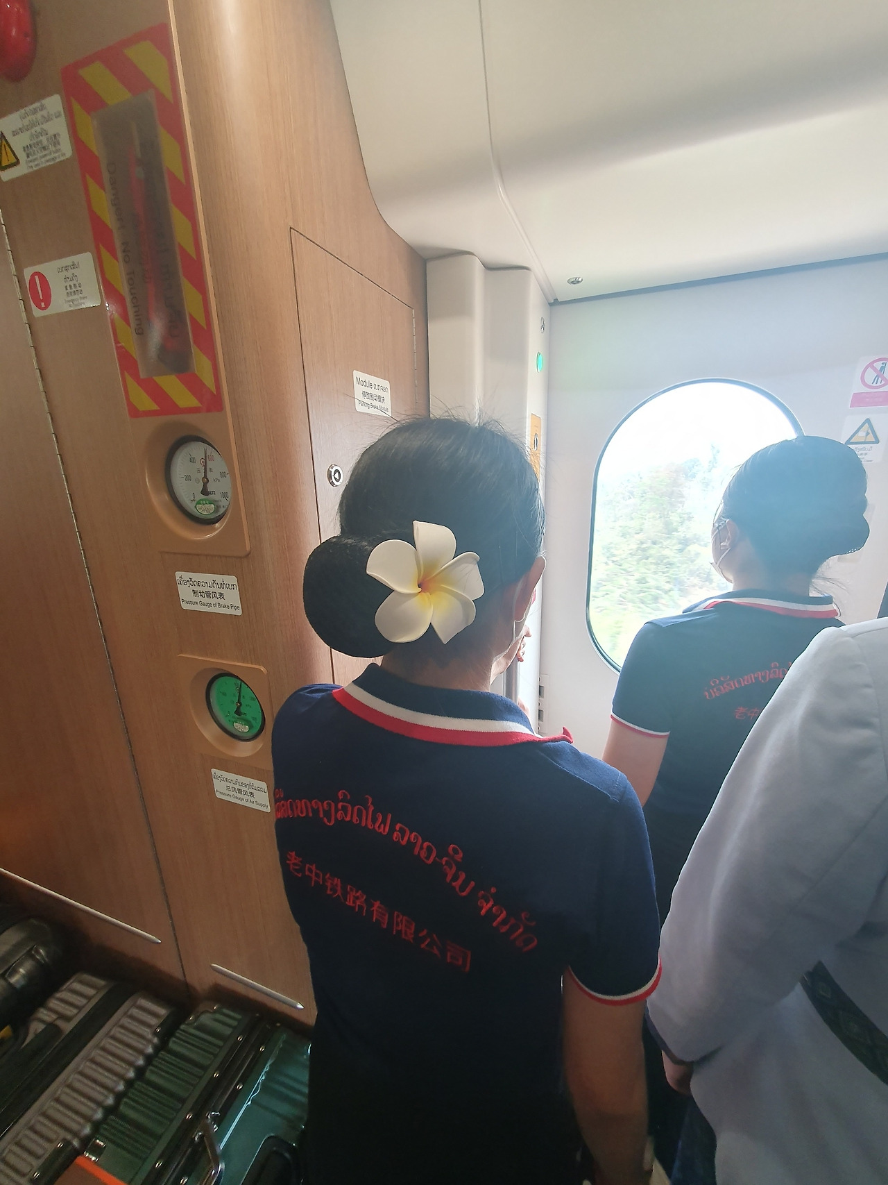 두 종류의 제복을 입은 열차 승무원은 모두 참파 꽃을 꽂고 있었다. 남자 승무원은 안 꽂는다.