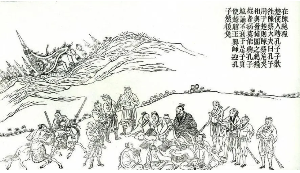 ‘진나라에서 식랑이 떨어지다. (在陈绝粮)’. 식량이 떨어지면 굶는 수밖에 없다. 게다가 누군가 때리러 오는 장면이다. (출처, baidu.com)