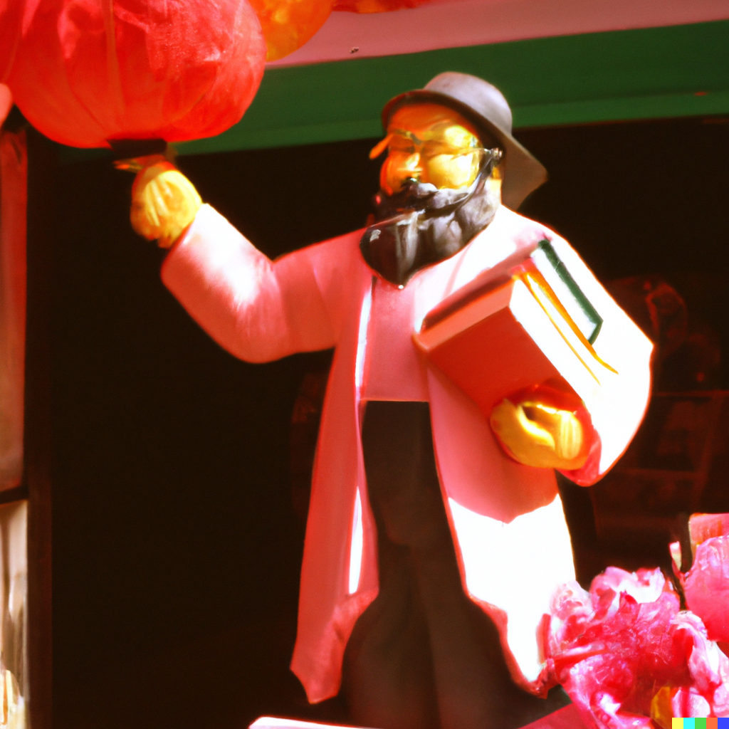 마르크스가 공산당 선언을 들고 한국의 절에서 연등을 파는 모습. AI가 그렸다.
