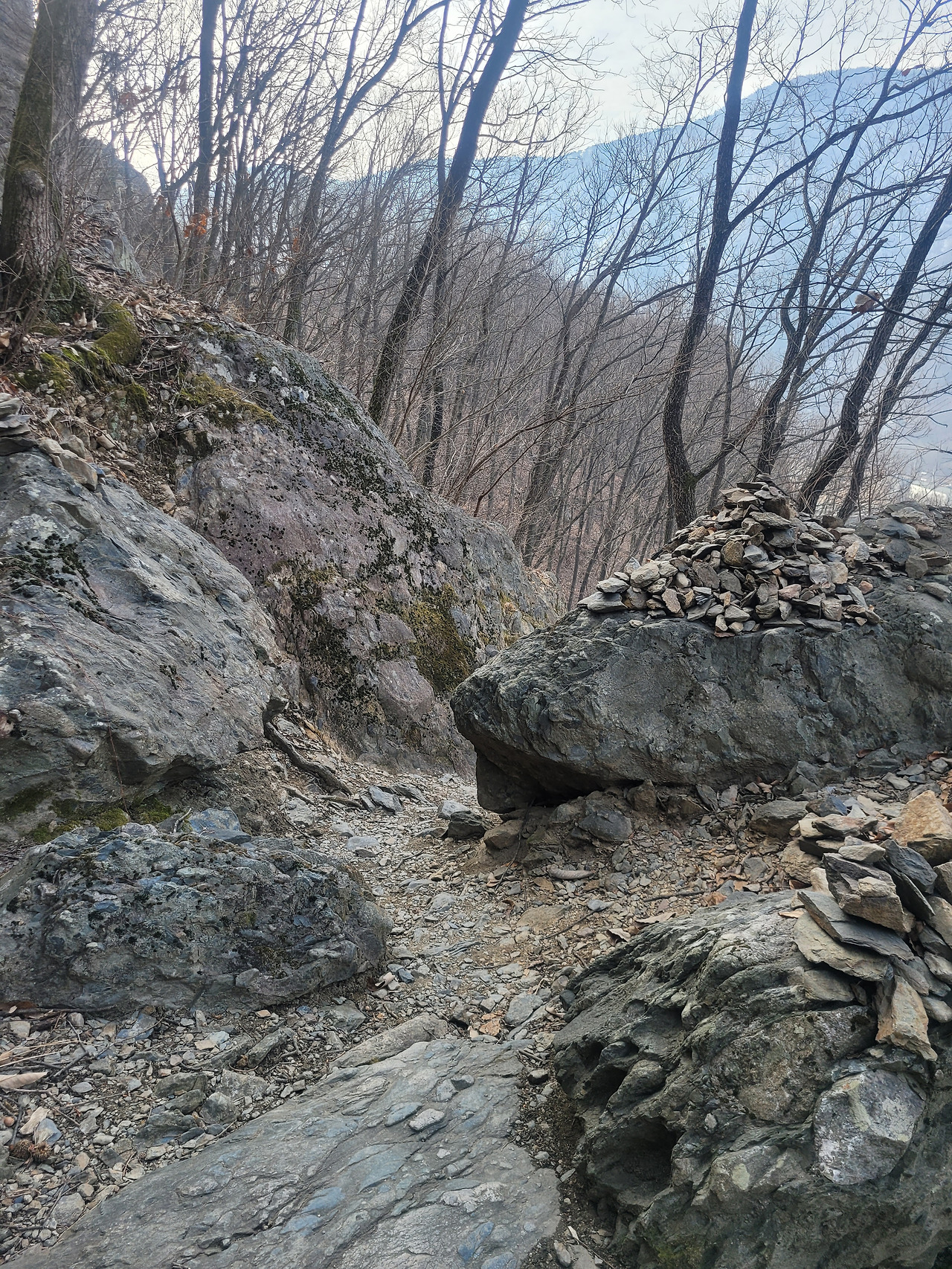 대문 그림 : 문경 관갑 잔도 넘어가는 길 중간에 큰 돌 두 개 위에 통나무 하나를 얹어 우드슬랙 의자를 만들어 놓았다. 서울가 망해서 집으로 가다가 여기쯤 앉아서 집으로 갈까 말까 생각해 보라고 만들어 놓은 것 같다.