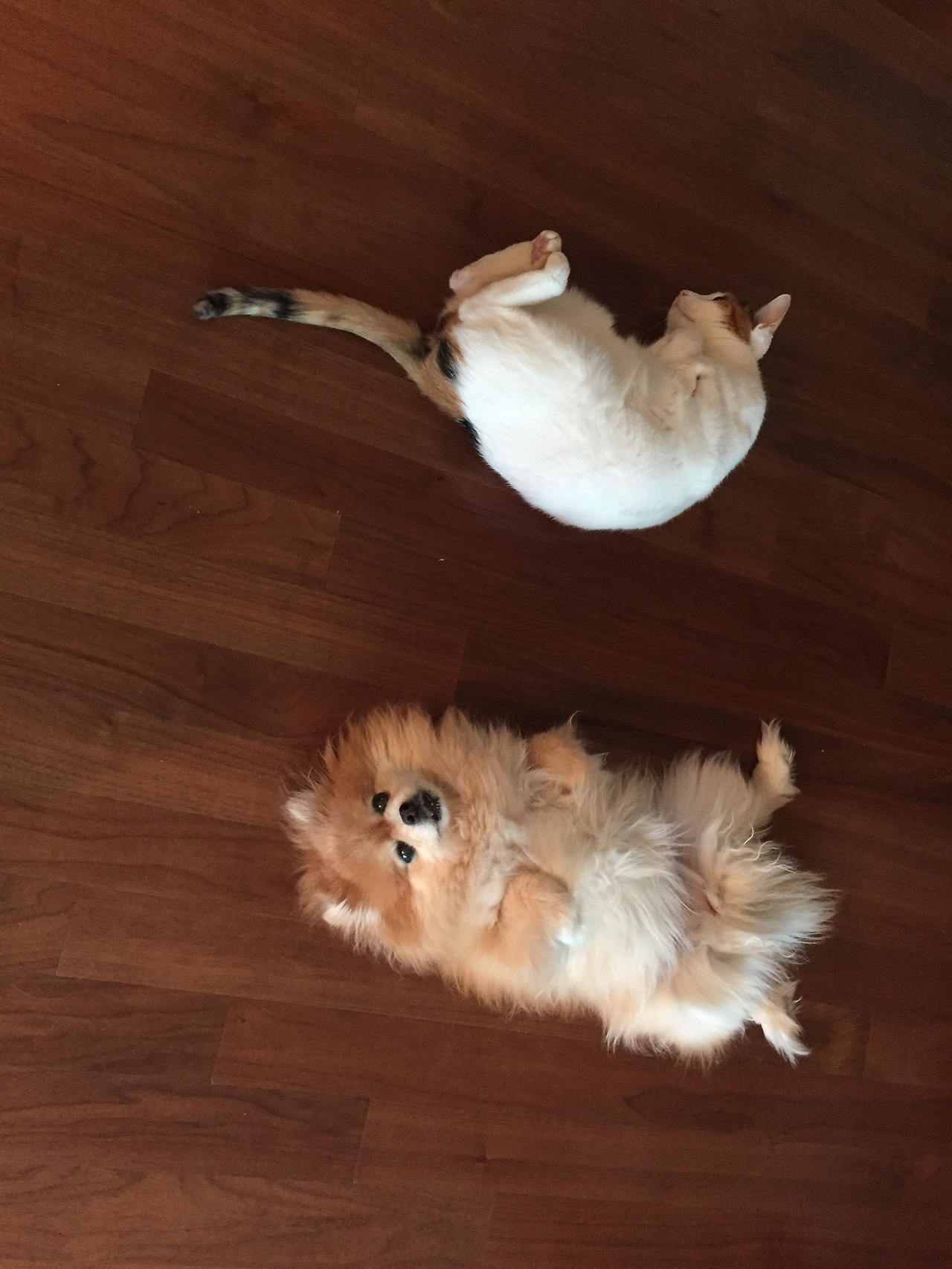 그 이후로도 개털이 와 고양이는 접촉이 많지는 않았다. 하지만 딸아이가 교환학생 학생으로 유럽으로 출국해 없는 동안에는 사정이 좀 달라졌다. 고양이가 갑자기 나와 아내에게 들이대기 시작한 것이다. 책을 읽고 있으면 ‘펄쩍 뛰어’ 무릎 위에 올라오기도 하고 심지어 누워있을 때 배에 올라타기까지 했다. 당연히 개털이는 질투심에 짖어대며 야단쳤고 고양이가 내려오면 소처럼 ‘머리로 들이받았다’ 하지만 딸아이가 귀국 하자 고양이는 태도가 완전히 돌변해 이전과 마찬가지로 ‘쌩(3)’을 까 더 이상의 문제는 없었다. 개털이가 늙어가면서 가끔 고양이 밥을 슬쩍 먹기도 하고, 짜 먹는 고양이 간식에 관심을 보이기도 해서 둘이는 오히려 적당한 “사회적 거리”를 유지하는 사이가 되어갔다.